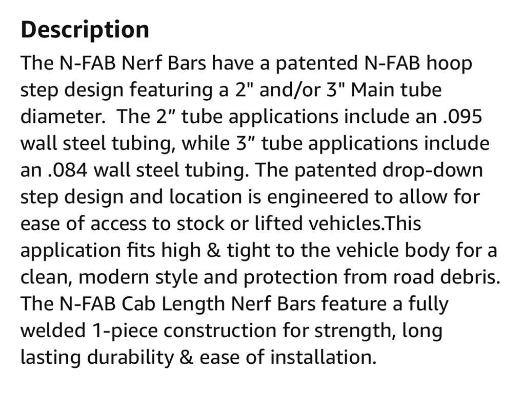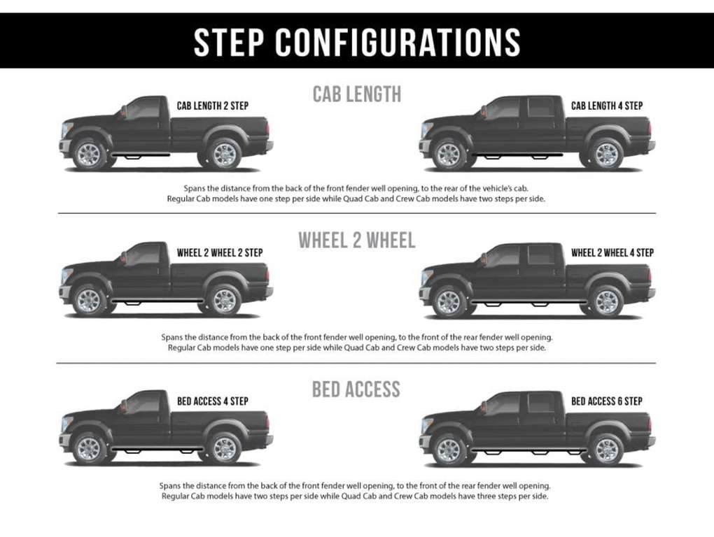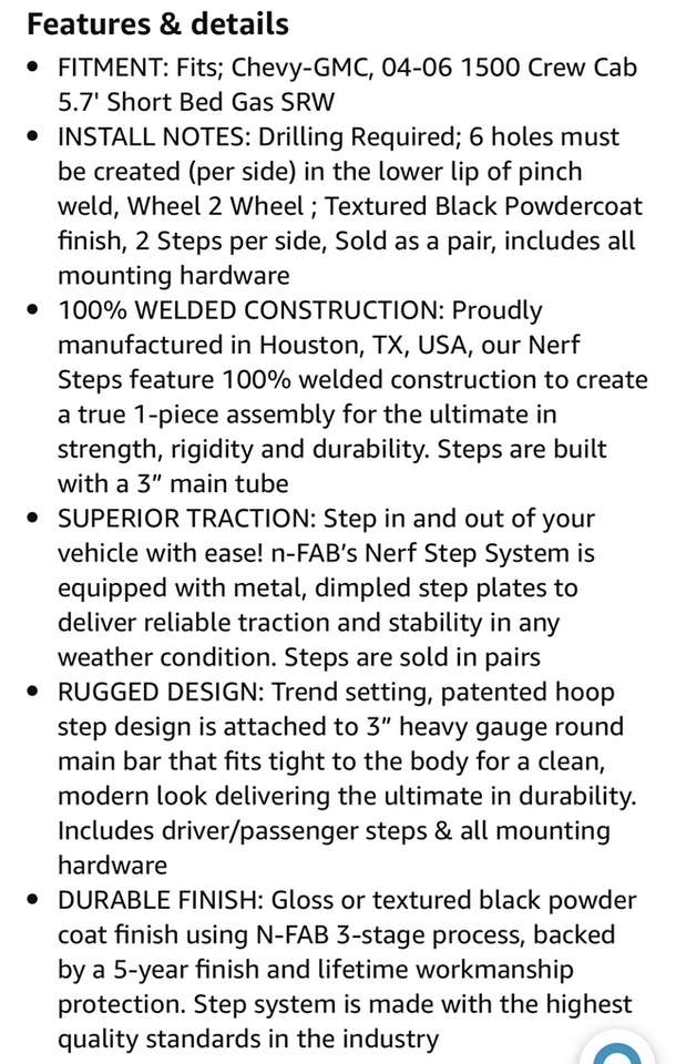 Description- Wheel to wheel, textured black nerf steps for 2004–2006 Chevy/GMC 1500 crew cab with 5.7’ Bed. See photos for more product information and specifications.