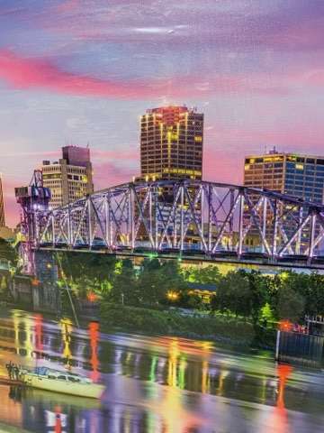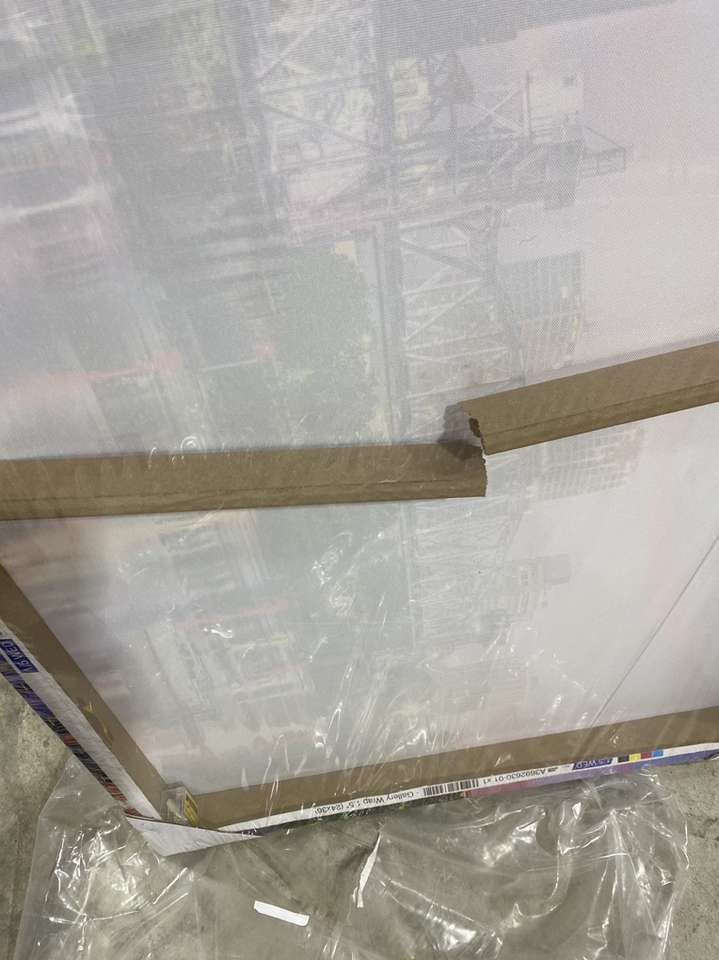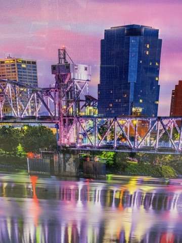 New canvas scene in colors of purple. Sky city scape with water back middle frame is broken