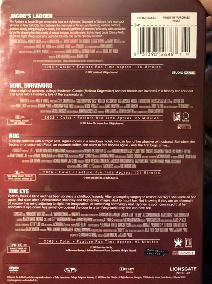 FOUR Horror Movies One Case: Jacob’s Ladder, Bug, The Eye, AND Soul Survivors- The Killer Cult”. This 3 disc set (one disk has a movie on each side) is in PRISTINE condition- no scratches. I think they were only watched once. Photographs are of the exact set of movies. Smoke Free.