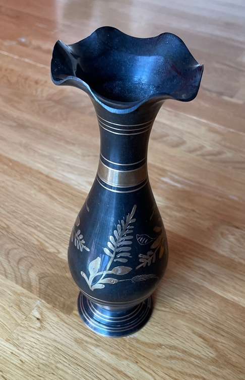 Vintage black and gold brass vase. Made in India. It is 8” high. $10