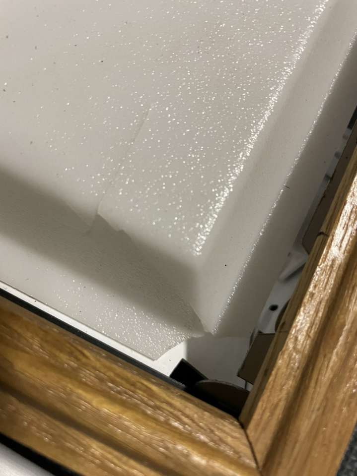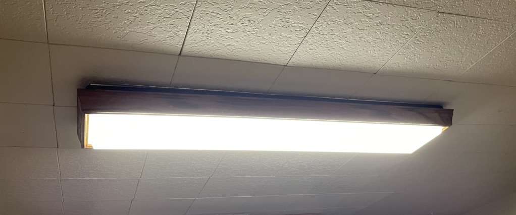 Fluorescent light fixture. Works great. Nice oak box frame. Has a small crack in the corner, not very noticeable when hung. See pics.
