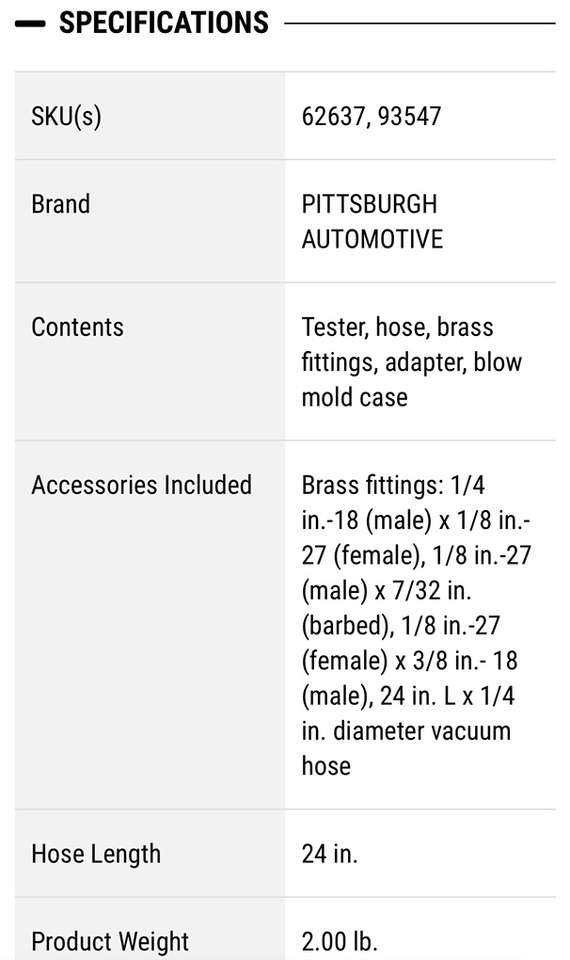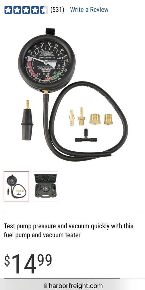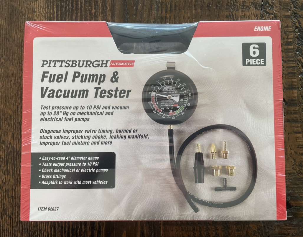 Description- Fuel pump and vacuum tester with protective storage case and all necessary fittings/adapters. See photos for more product information and specifications.