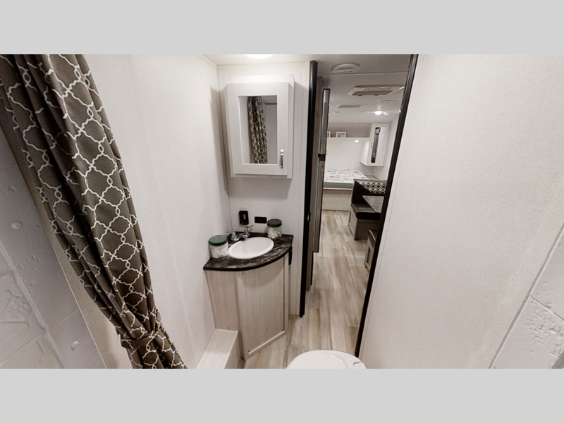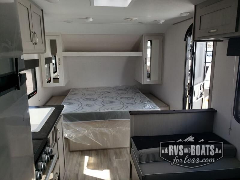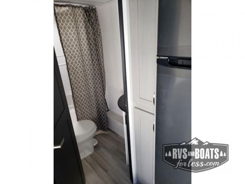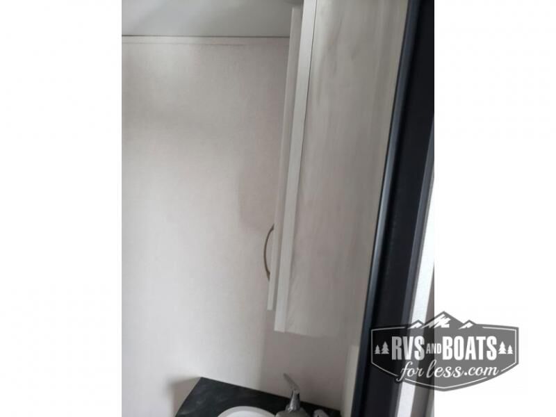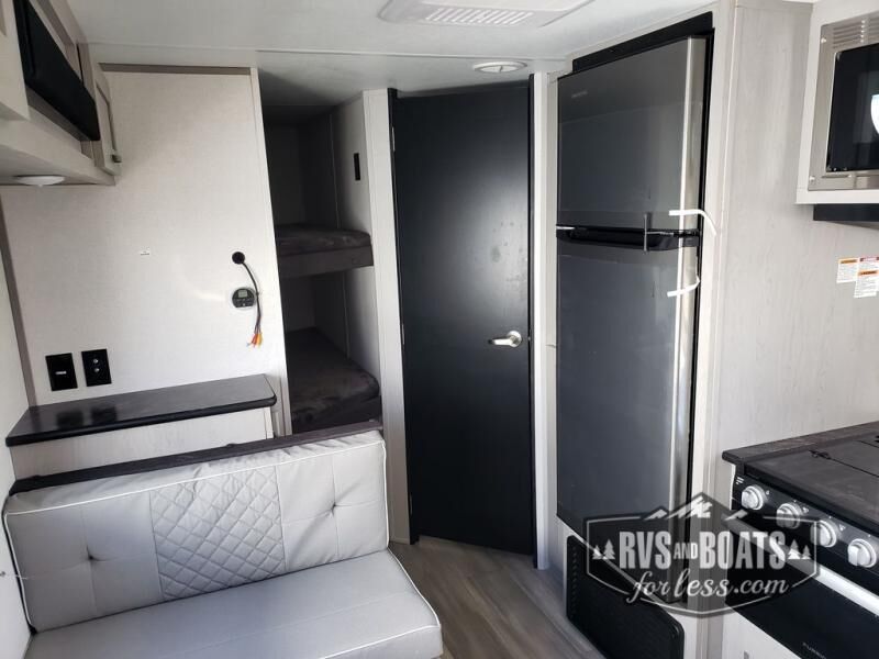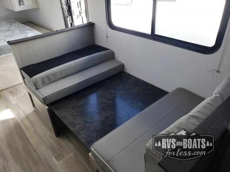 If you are searching for bunk beds, this trailer offers the double-size version! And you will love the easy towing and gasoline savings when heading to your campsite. There is a full-size dinette that doubles as sleeping space and offers storage, kitchen appliances and a pantry, plus a full bathroom with a full-size shower. And the front queen bed allows you access on either side and includes dual wardrobes. So load up and enjoy!