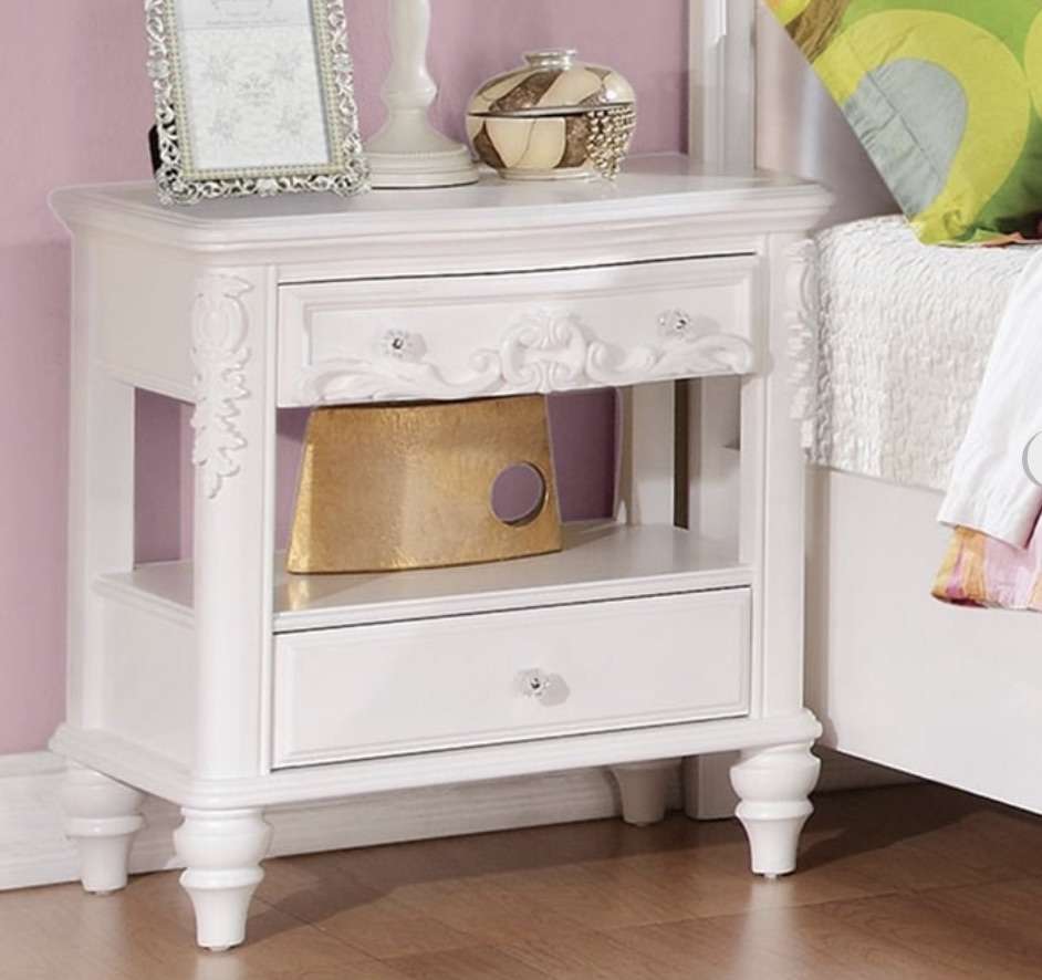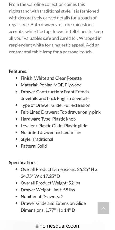 Description- Carolina collection 2-drawer nightstand. No Assembly required. ONE AVAILABLE. See photos for more product information and specifications.