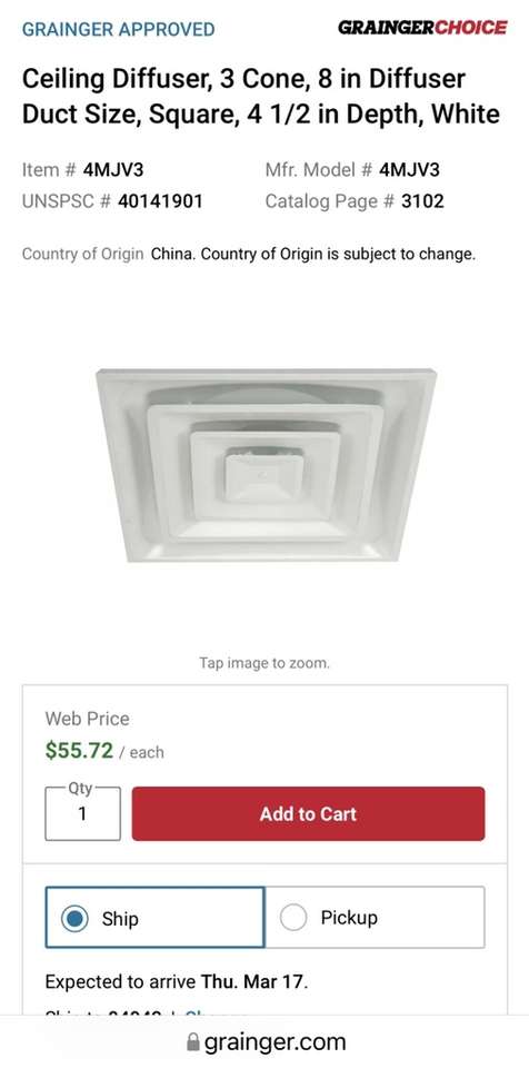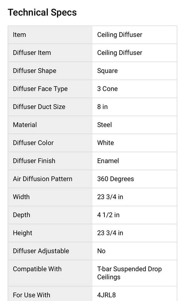 Description- 2’x2’ 3-cone ceiling tile diffuser for 8 inch supply. See photos for more product information and specifications.