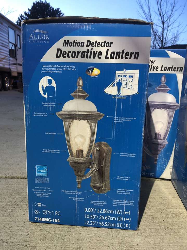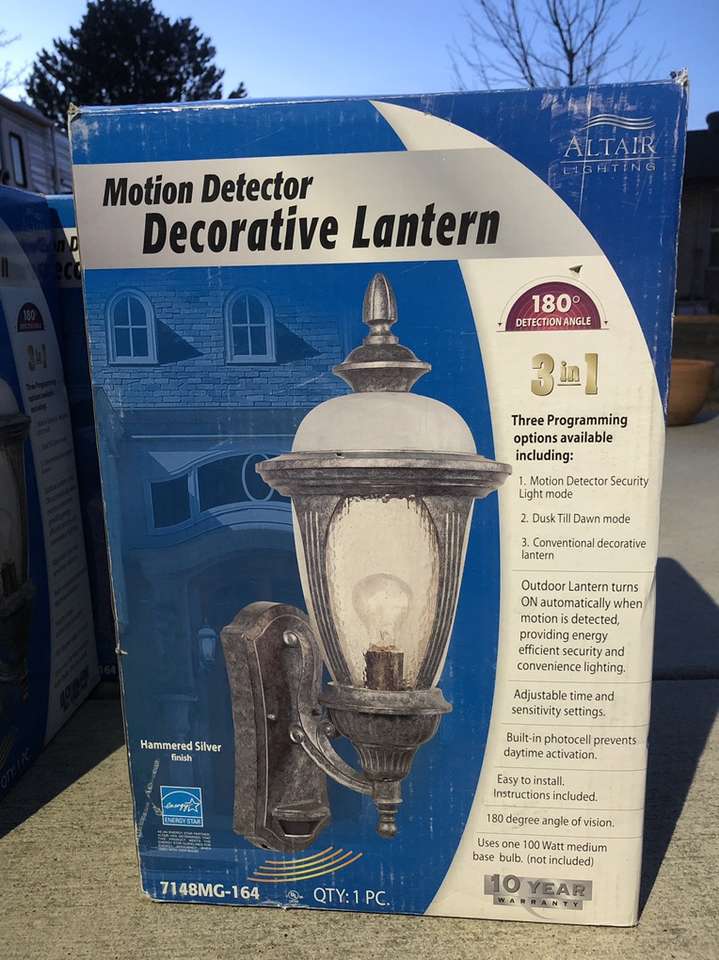 Three Hammered Silver wall lanterns with motion sensors. 22.25” high, 9.0” wide and 10.5” deep. Can be programmed for 1)motion detection, 2)dusk till dawn mode or 3)conventional on/off with switch. These are new, never installed. Must take all three. Cash only. No codes or scammers.