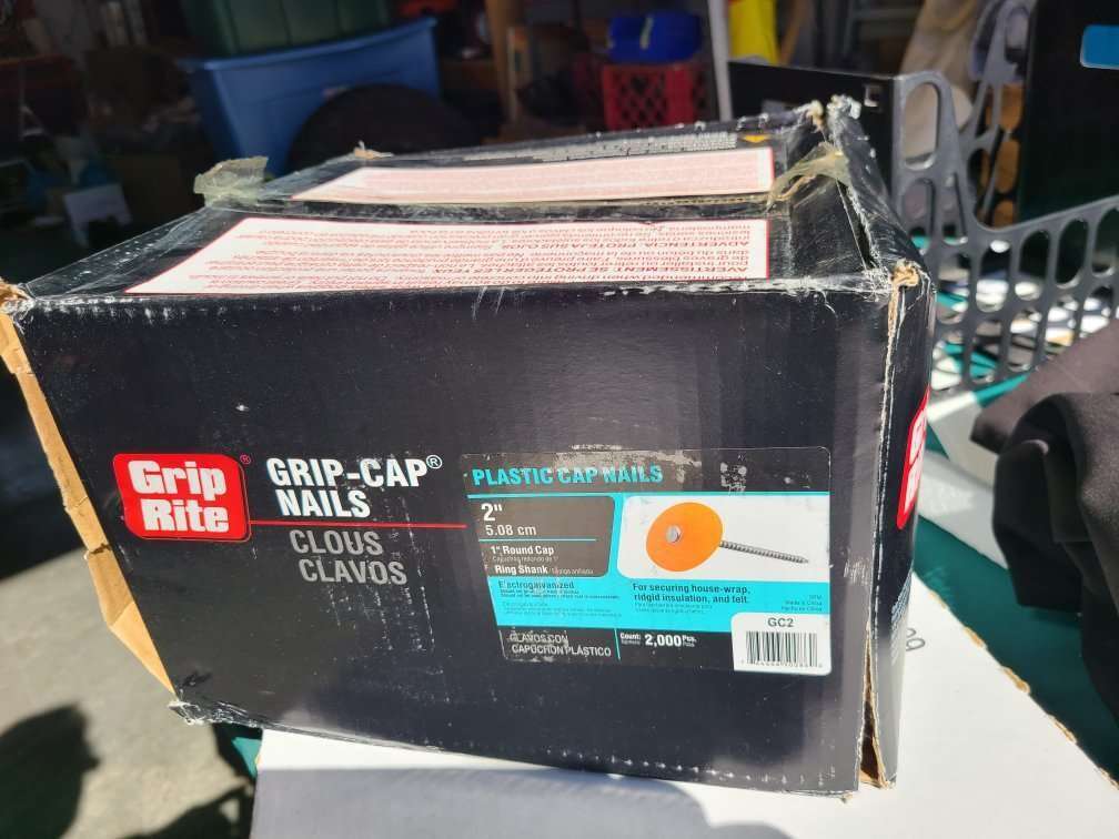 2000 count NAIL CAP- Grip-Rite Length: 2 in. Nail Type: Cap Finish: Electro-Galvanized Material: Plastic/Steel Product Type: Nail Head Type: Full Round Head Container Size: 9 lb. Indoor or Outdoor: Indoor and Outdoor Head Diameter: 1 in. Point Type: Sharp Gauge: 12 Ga. Packaging Type: Boxed Shank Type: Ring Shank Number in Package: 2000 pk Color: Silver Grip-Rite 2 in. Cap Electro-Galvanized Plastic/Steel Nail Full Round 9 lb..