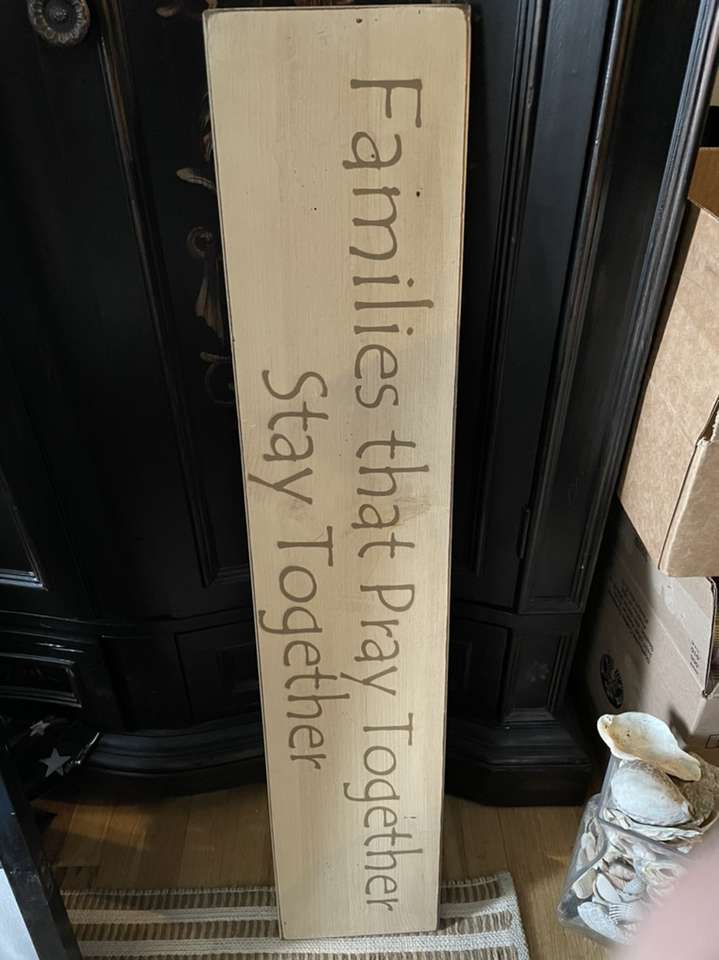 Long wooden plaque with the saying, “Families who pray together, stay together”. Quote is painted on. Beige, brown colors.