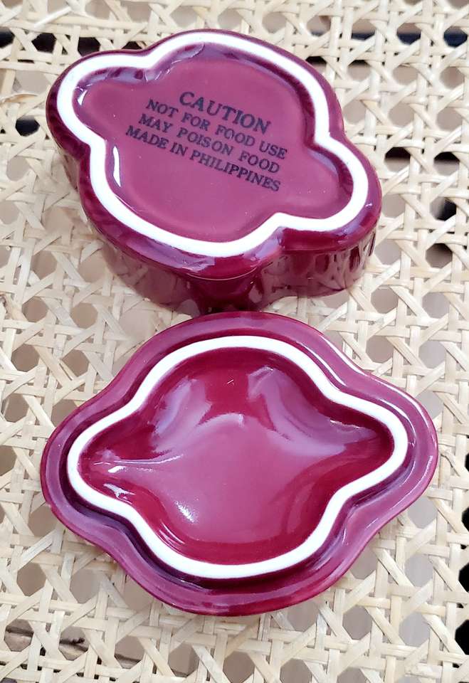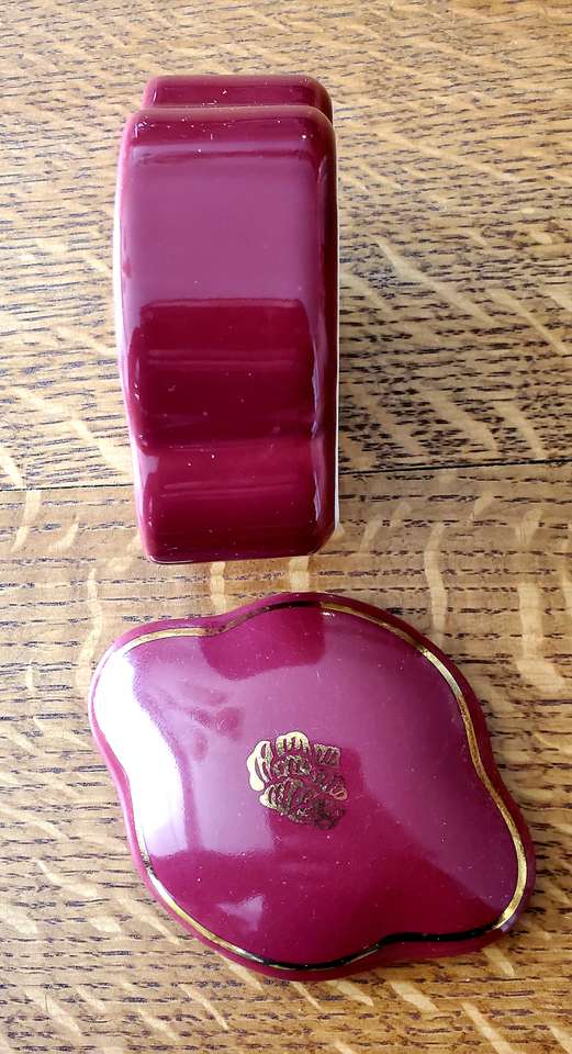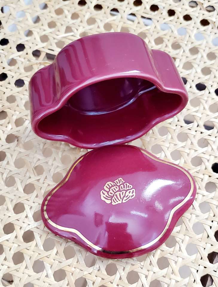 Scalloped, Gold Rimmed, Purple Ceramic Pill Box/Trinket Holder with Gold Lotus Flower Design. 3