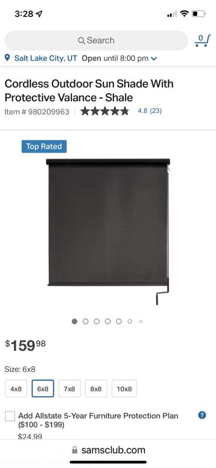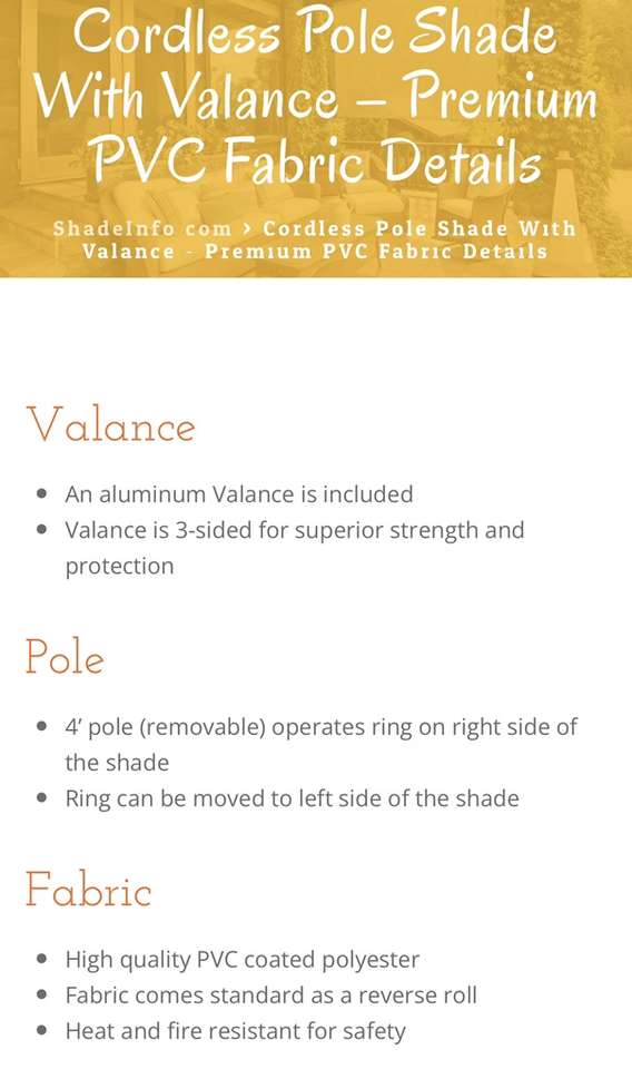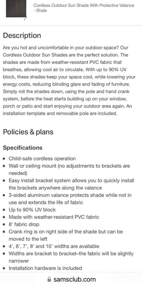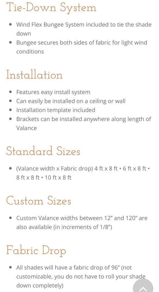 Description- 6’ Wide by 8’ tall (if you don’t need an 8 foot tall shade you just don’t have to unroll it any further than you need) wand operated outdoor roller shade with valance and premium dark brown fabric. See photos for more product information and specifications.
