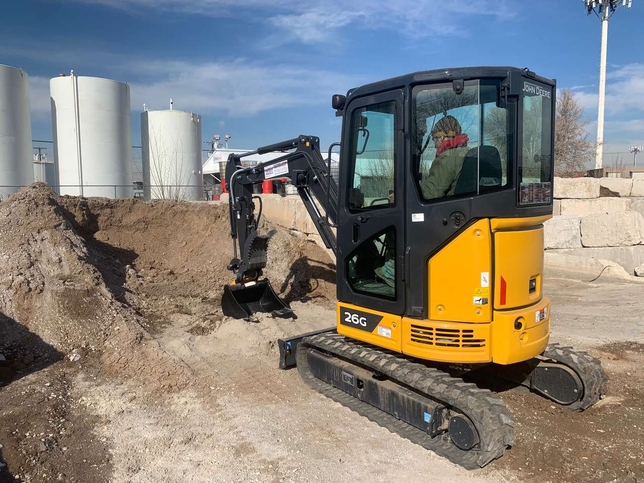 Specs: Operating weight: ~7,000 lbs Dig depth: 8’6” Width: 5’1” (fits in most side yards) Zero tail swing for tight spaces