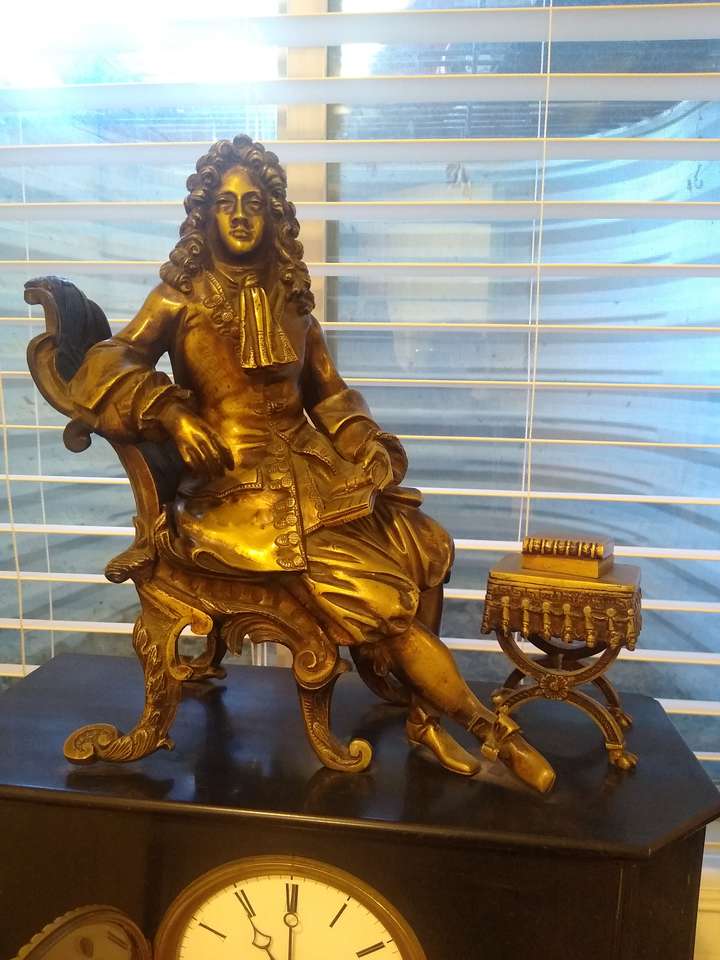 French 19th century mantel clock with bronze statue on marble base. Good working condition.