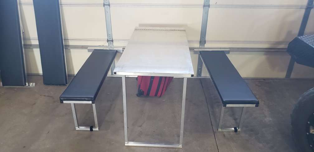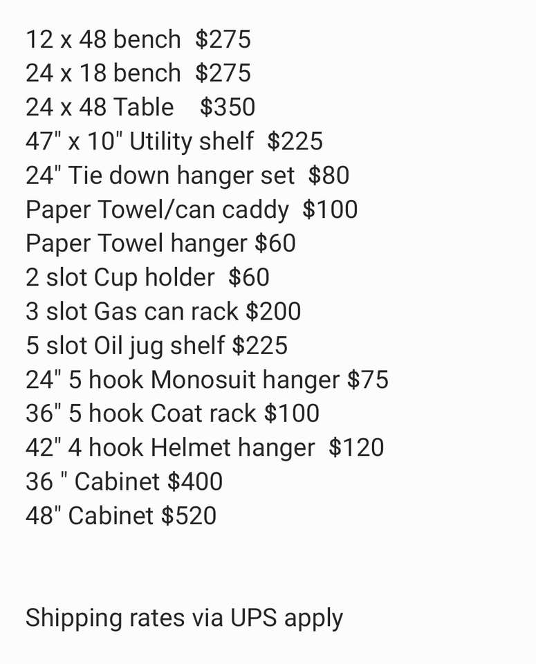 12 x 48 bench $275 24 x 18 bench $275 24 x 48 Table $350 47" x 10" Utility shelf $225 24" Tie down hanger set $80 Paper Towel/can caddy $100 Paper Towel hanger $60 2 slot Cup holder $60 3 slot Gas can rack $200 5 slot Oil jug shelf $225 24" 5 hook Monosuit hanger $75 36" 5 hook Coat rack $100 42" 4 hook Helmet hanger $120 36 " Cabinet $400 48" Cabinet $520