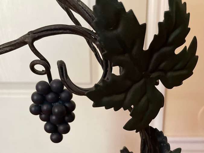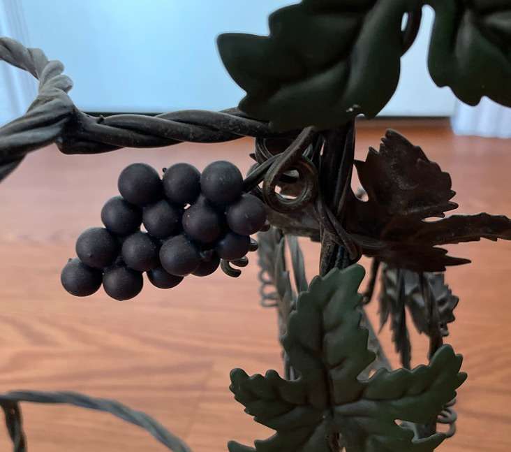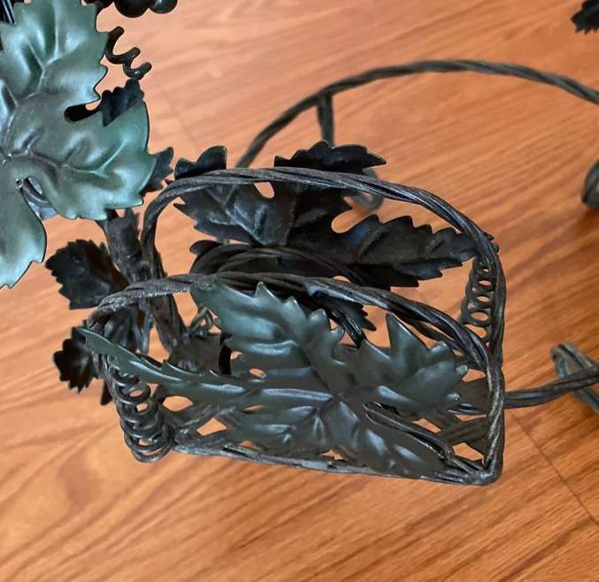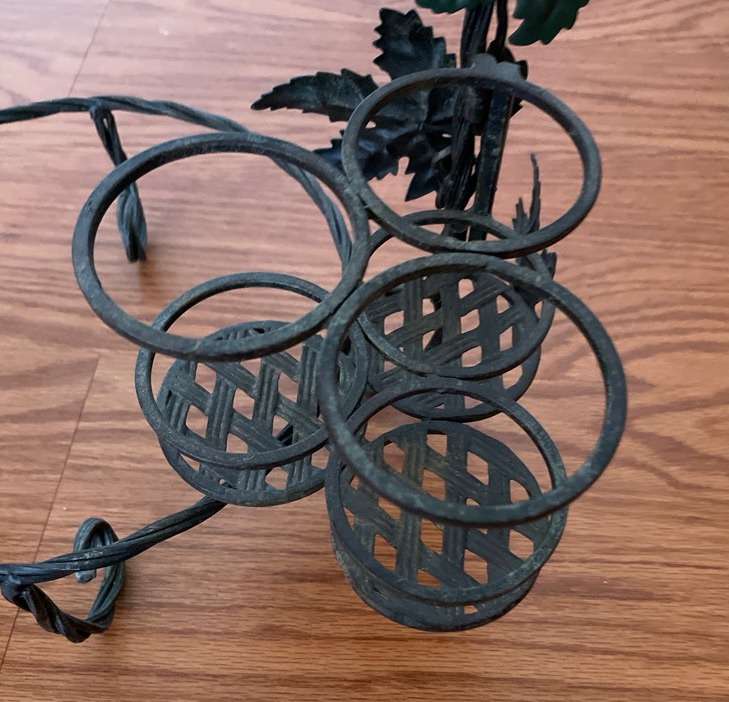 Super elegant 2 tier green metal wire/rod desert/fruit stand. Can be used as a plate holder because there are attached napkin holder and plastic cup holders. It is 19” high x 16” wide, top plate holder is 7”.across and the bottom plate holder is 9” in diameter. $20.