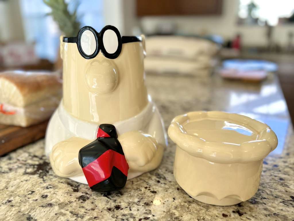 Who doesn’t love some Dilbert office humor?! This is a great cookie/storage jar. It’s in excellent condition, no chips or cracks and the finish is very shiny. In addition to cookies/snacks it can also be used to store coffee pods, general office/craft supply or whatever else you need. It is a large jar, 12” tall. The jar is about 20 years old. It comes from a smoke free home. Cash only please.
