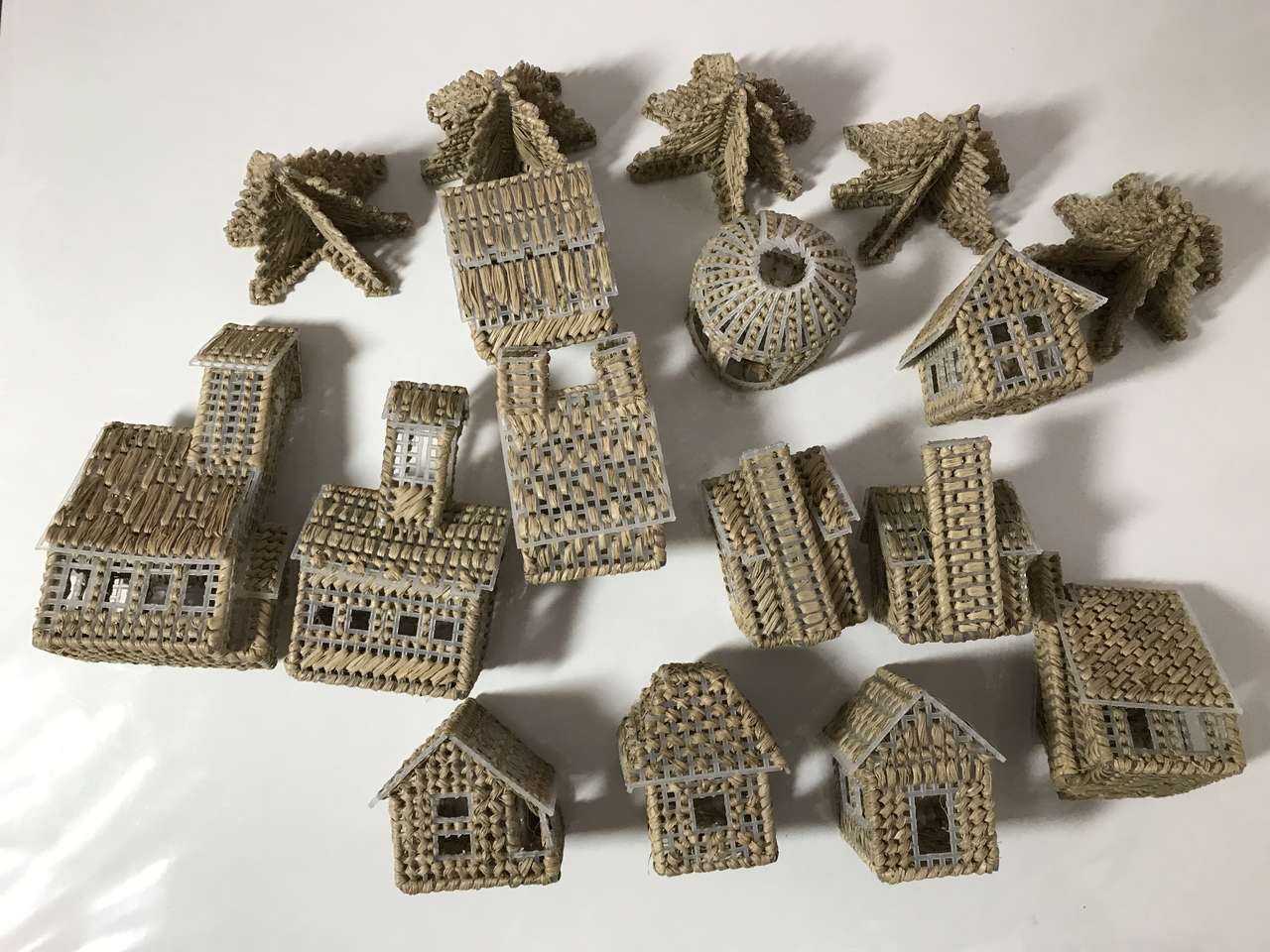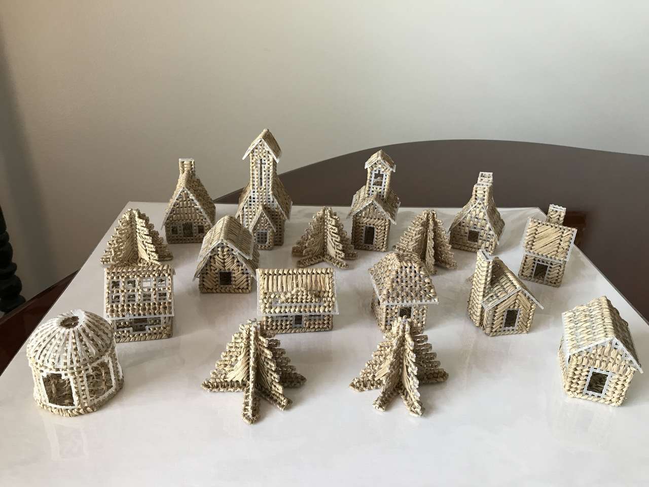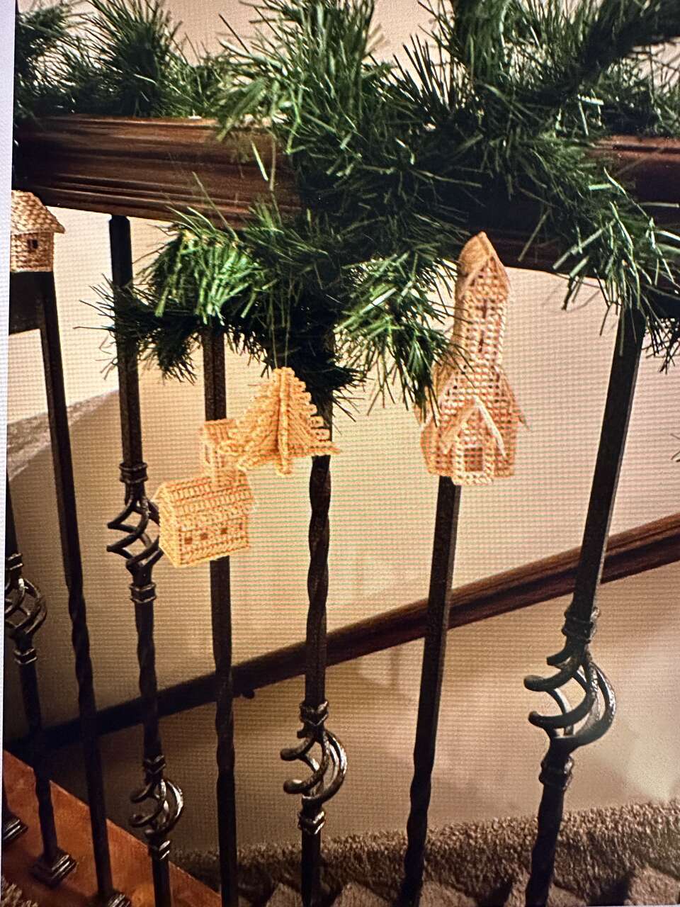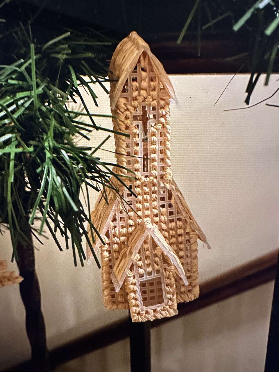$75.00 for all 17 Christmas Village Tree Ornaments Handmade with Plastic Canvas and Raffia, New. Includes 1 Church, 1 Schoolhouse, 1 Gazebo, 5 Trees and 9 houses a total of 17 ornaments. The Churchhouse is 4 3/4" x 2 3/4" and is the largest ornament. Each ornament will have clear fish line on top of ornament for hanging on your tree. Materials used in making these ornaments are new. Last 3 photos are an example of how to use these for your Christmas decor. The Raffia is a little lighter in the examples.