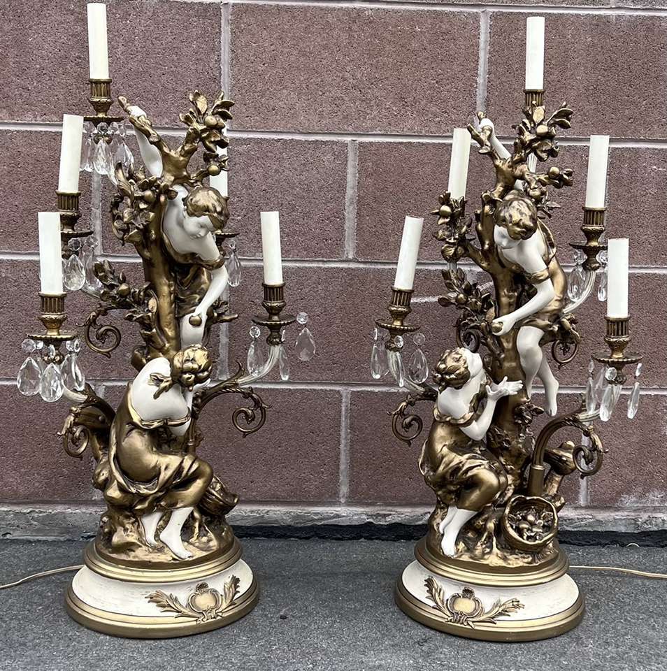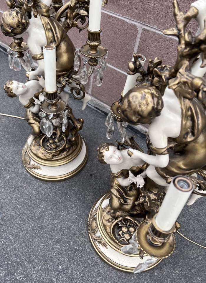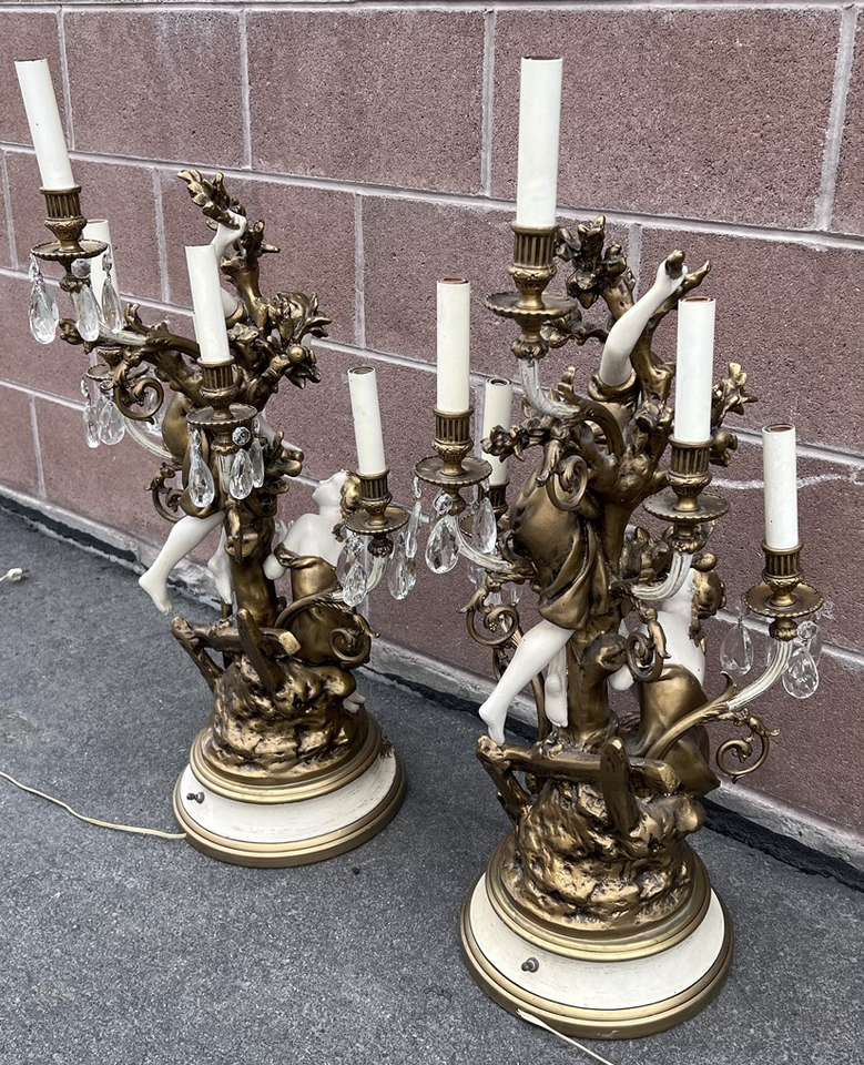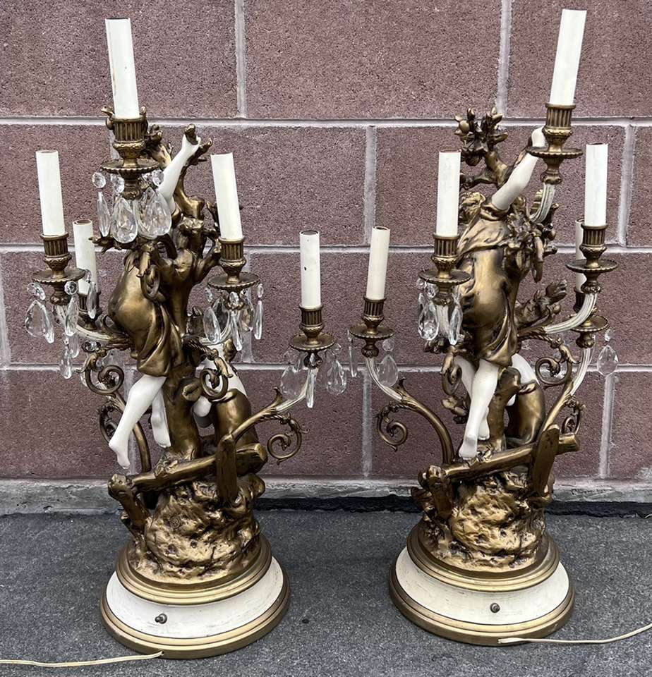 SLC. These are amazing! And in great condition. They do need new bulbs, shades and I believe 13 replacement glass crystals. Price is for the pair. Minor paint loss. One has tape on the cord but it still works just fine! These are very heavy spelter. By Moreau for Collection Francaise. 19 inches tall. Cash, Venmo Text is best