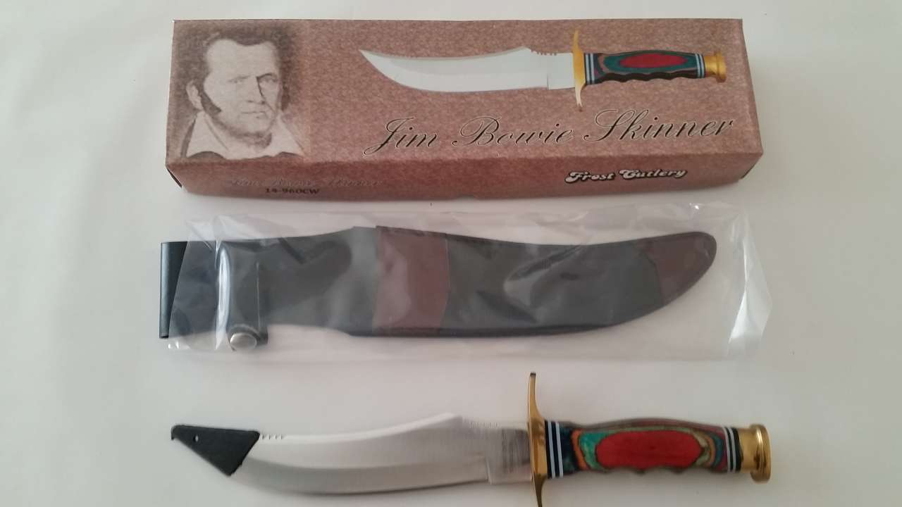 Frosty Cutlery Jim Bowie Skinner Knife 14-960CW 13 1/2" Overall Sugical Steel Blade, Hunting Knife Brass Bolster, Color Wood Handle w/Leather Sheath New in Box $33 Text Only 801-916-9191