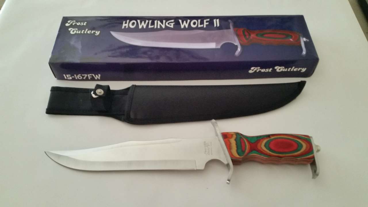 Frosty Cutlery Howling Wolf II Knife 15-167FW 16 1/2" Overall Bowie Stainless Steel Balde Frost Wood Handle w/Nylon Sheath New in Box $33 Text Only 801-916-9191