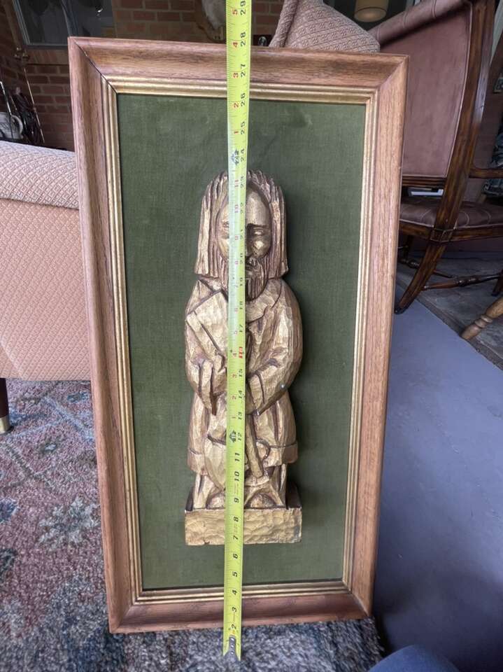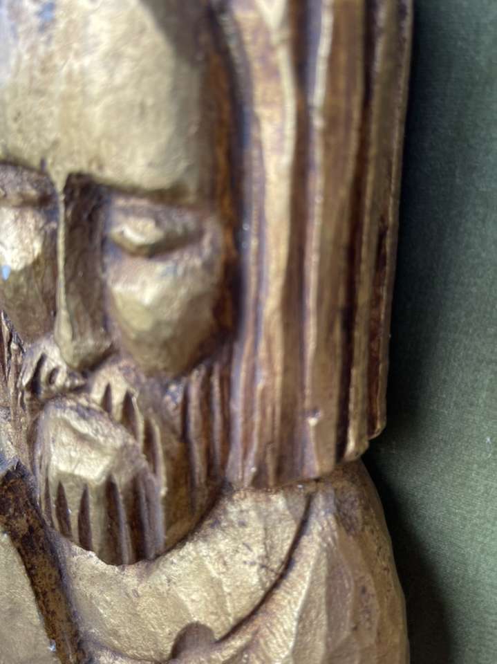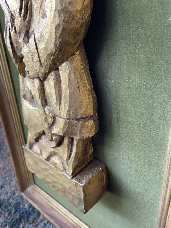 Beautiful hand carved wood sculpture with gold finish of a Viking holding an Axx mid century modern vintage piece 1960s mounted and framed ( super cool piece )