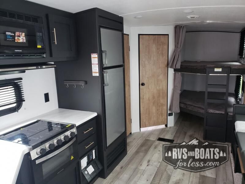 For the larger group, this Springdale is the perfect travel trailer because it features a set of double-size bunks, two entry doors, a large slide out, and sleeping for nine people. Step inside using the main entry and see just how spacious the combined kitchen and living area are. For a quiet retreat, enjoy the front bedroom where you can expect to get a great night's rest. The back of this trailer contains a set of double-size bunks that the kids or your friends will surely love. Or, you can easily take along extra guests. There is a convenient ladder to access the top bunk, and you will also enjoy the front exterior pass-through storage compartment for all of your outdoor camping gear.