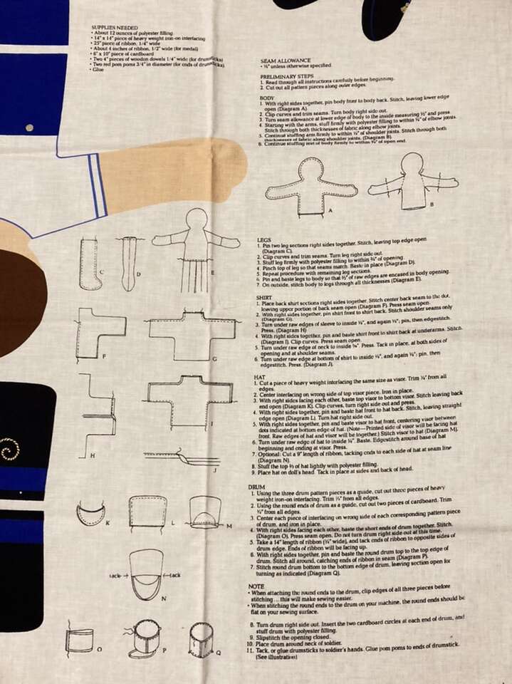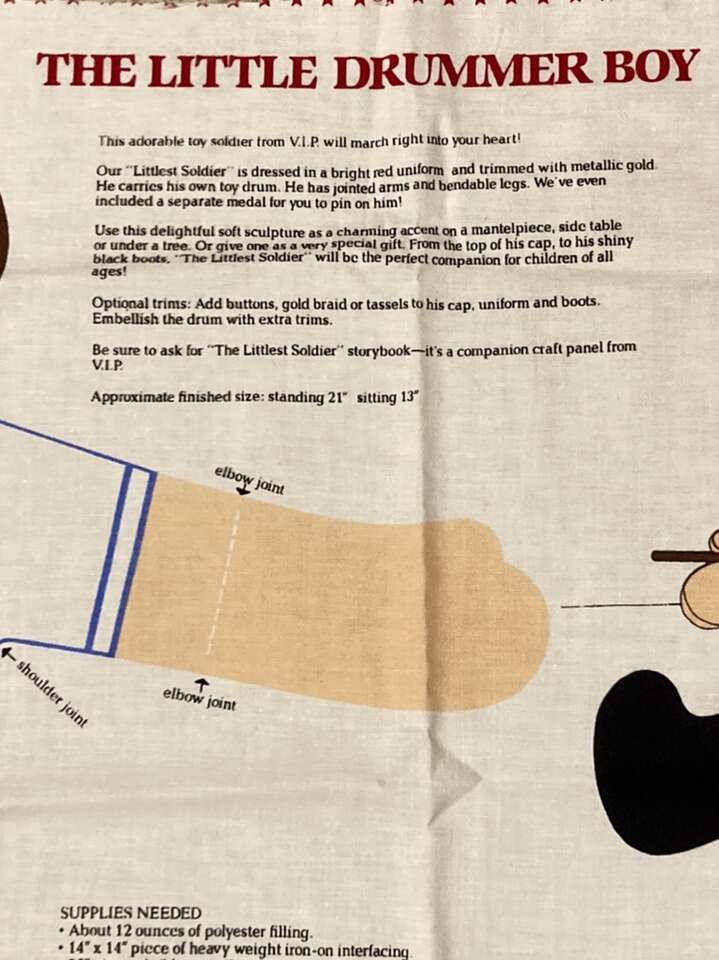 VenmoMake your own drummer boy doll with this vintage cut & sew craft. The panel measures 44 x 35.5. Approximate finished size: standing 21, sitting 13 Colors are still very nice and bright. From a smoke/pet free home. Pick up in Murray. See my other ads for more items.