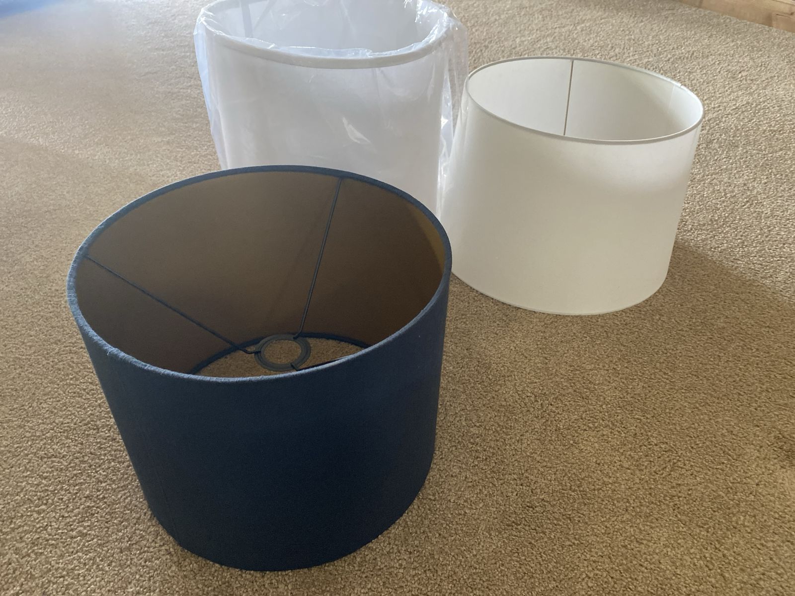 ALSO INCLUDED IS A WHITE LAMPSHADE SIMILAR TO THE BLUE ONE IN SIZE AND SHAPE. ALSO A WHITE LAMPSHADE THAT IS BRAND NEW BUT NEEDS A NEW TOP WIRE. ALL ARE CLEAN. SMOKE FREE HOME