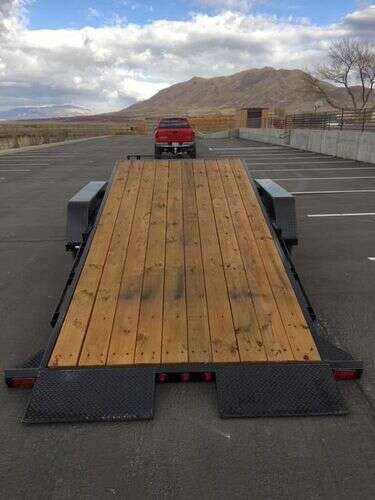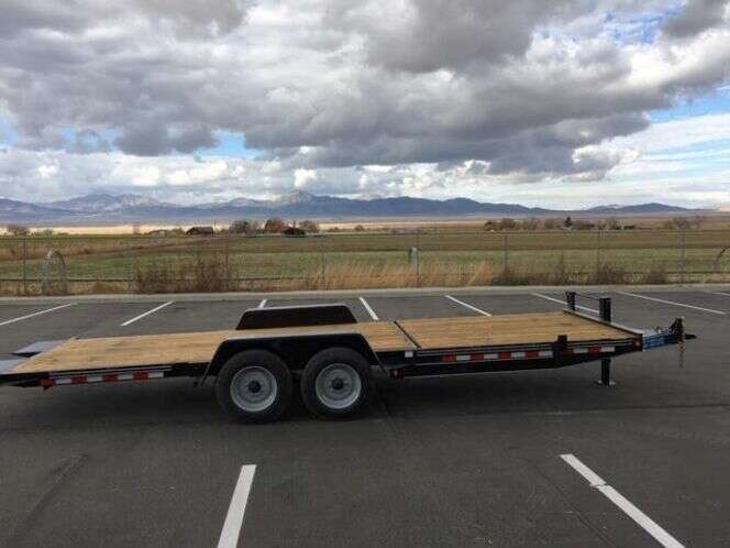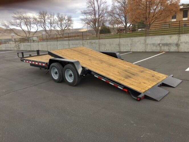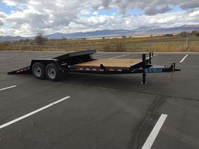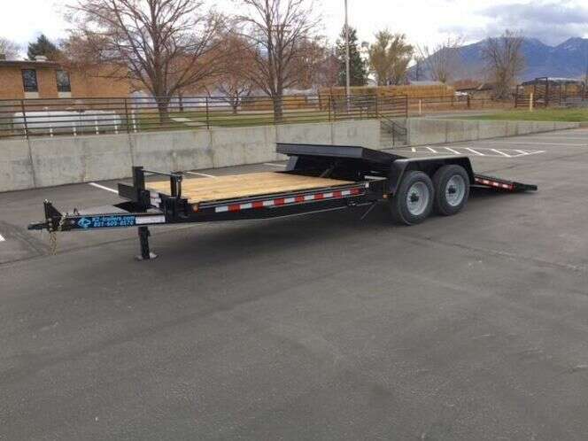 The 17000 GVWR Deluxe Wood Floor Tilt Equipment Trailer like all our other Deluxe models is fully equipped with all our best features. A heavy duty running gear package with heavier oil bathed axles, tires, and a super duty cast iron coupler are the key features. The running gear features 8,000 lb. 8 lug axles with 17.5 in. heavy duty load range H radial tires and heavy duty slipper spring suspension. The coupler is a super duty three bolt cast iron unit. The frame is 6 in. channel with a 6 in. channel wrap around tongue. A tool box with a lockable lid, 17 in. cross-member spacing, stake pockets with a rub rail on the outside, and full reflective tape are all included. A US made sealed modular wiring harness with lifetime LED lighting assures trouble-free lighting on every trailer. 1 year Warranty www.k2-trailers.com or find us on Facebook Call or Txt anytime Brian 801-472-1613 Chris 801-420-4076 Dealer 454A website: www.k2-trailers.com Visit us on Facebook https://www.facebook.com/k2trailers/ Teton snake river diamond c big tex walton mini excavator skid steer pj trailers Teton snake river diamond c big tex walton mini excavator skid steer pj trailers