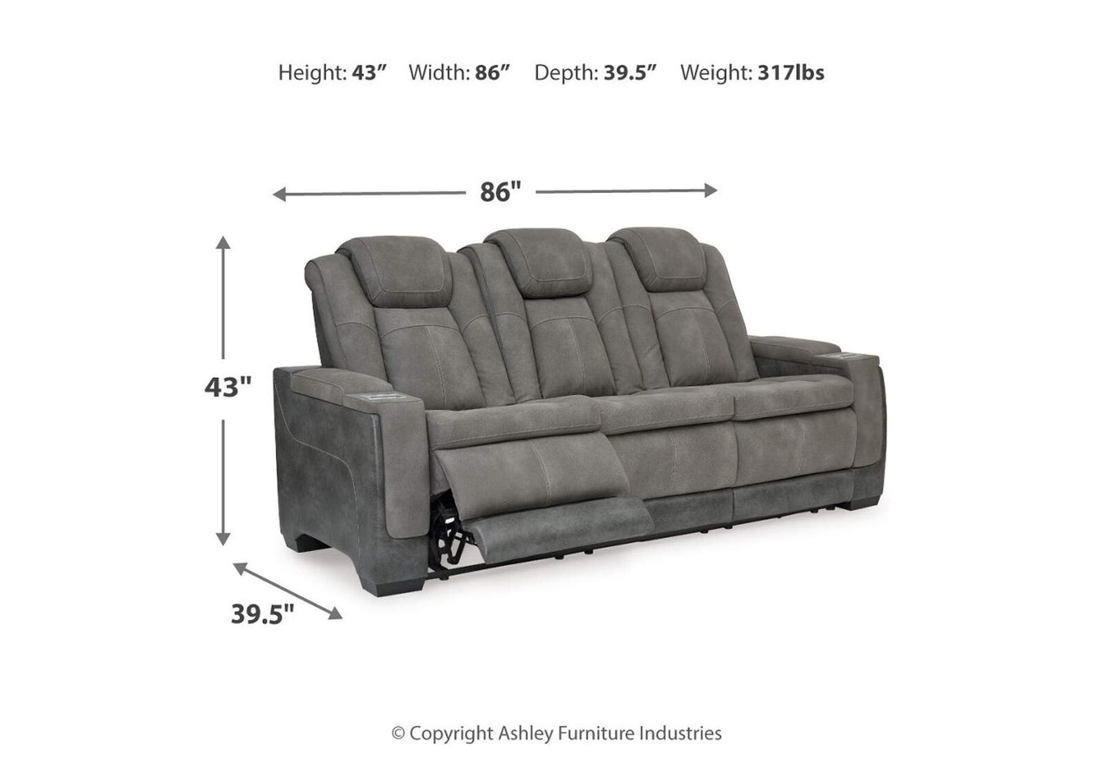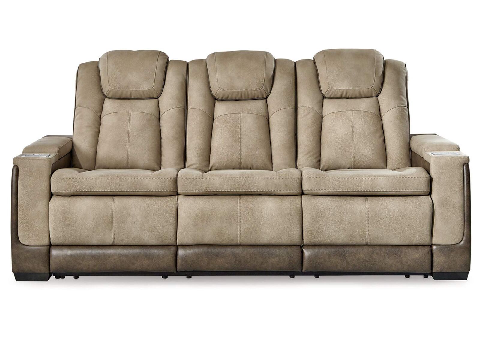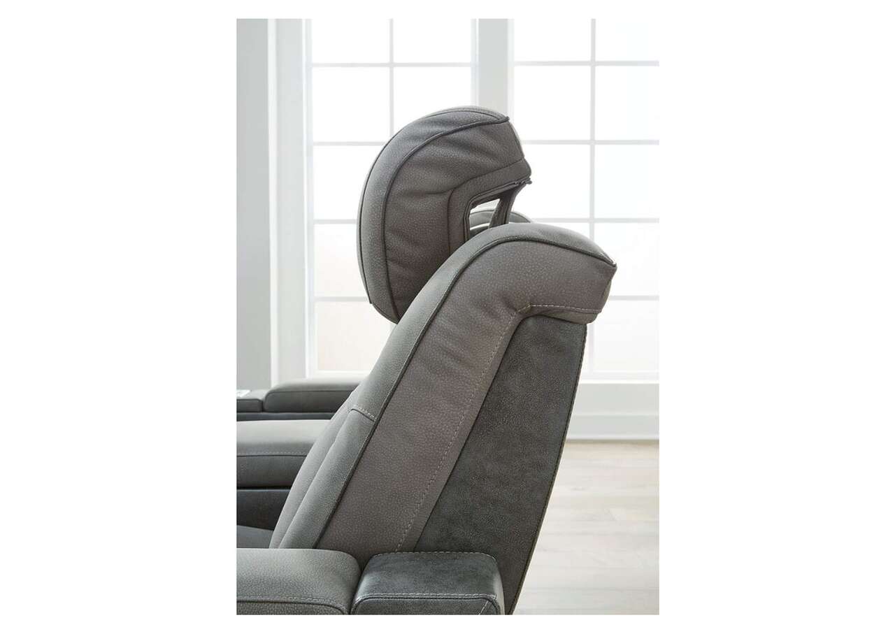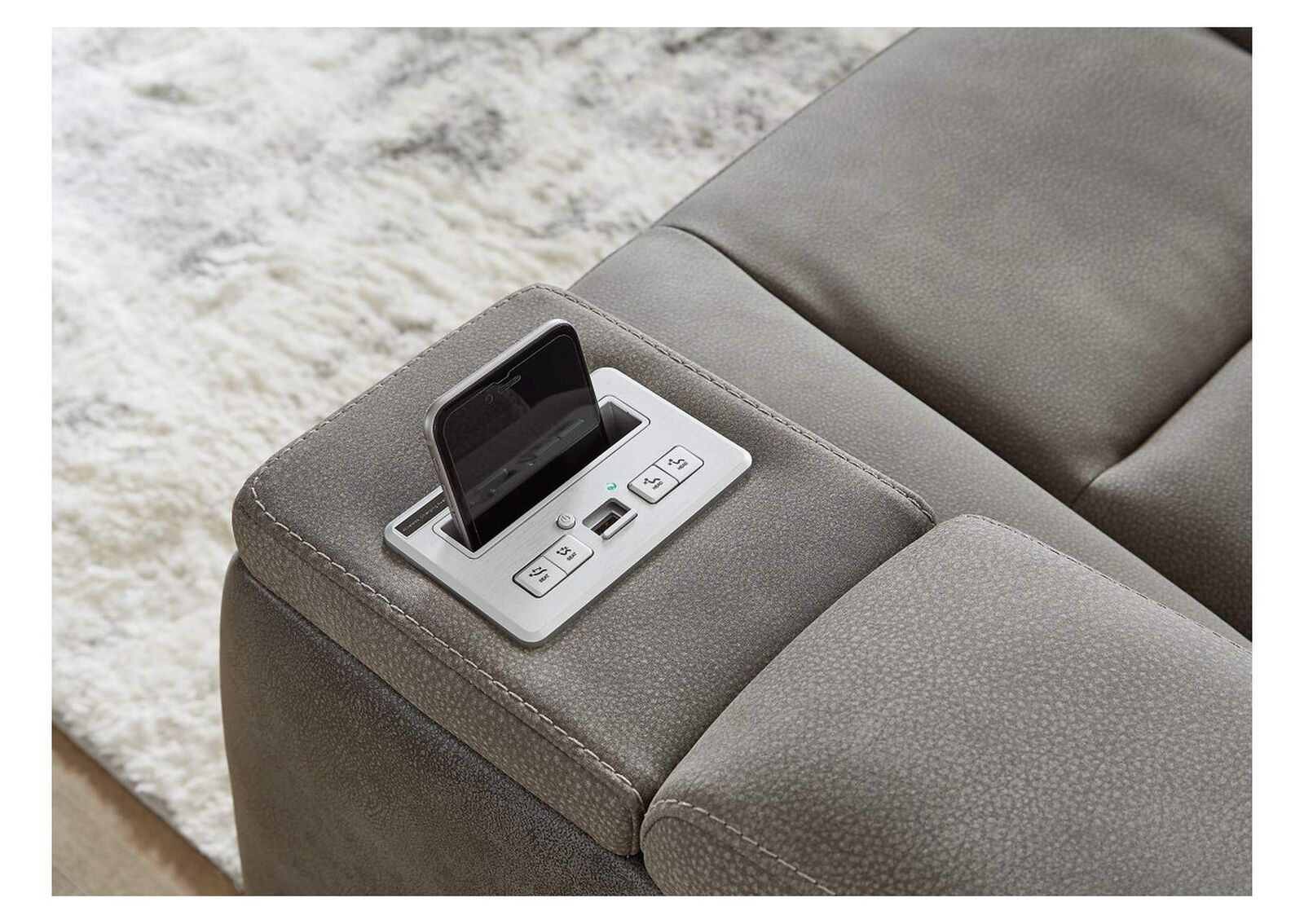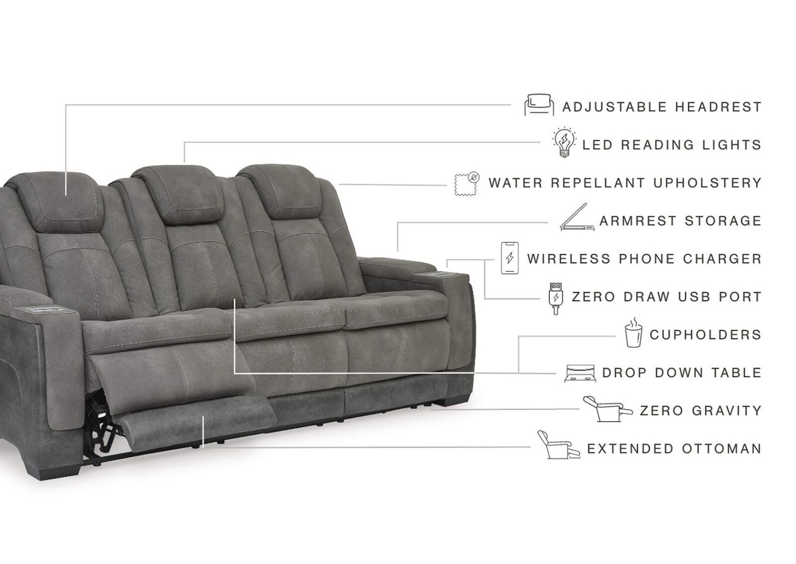 The sleek, ultra-modern Next-Gen DuraPella power reclining sofa with drop-down table has it all. With designer style and head-to-toe comfort, it has the upscale look of leather at a scaled-down faux leather price. Its gray two-tone upholstery is more durable and water-repellent than regular leather, an added bonus for families. Features including wireless and USB charging, an adjustable headrest and an extended ottoman make this the next generation of power recliners.