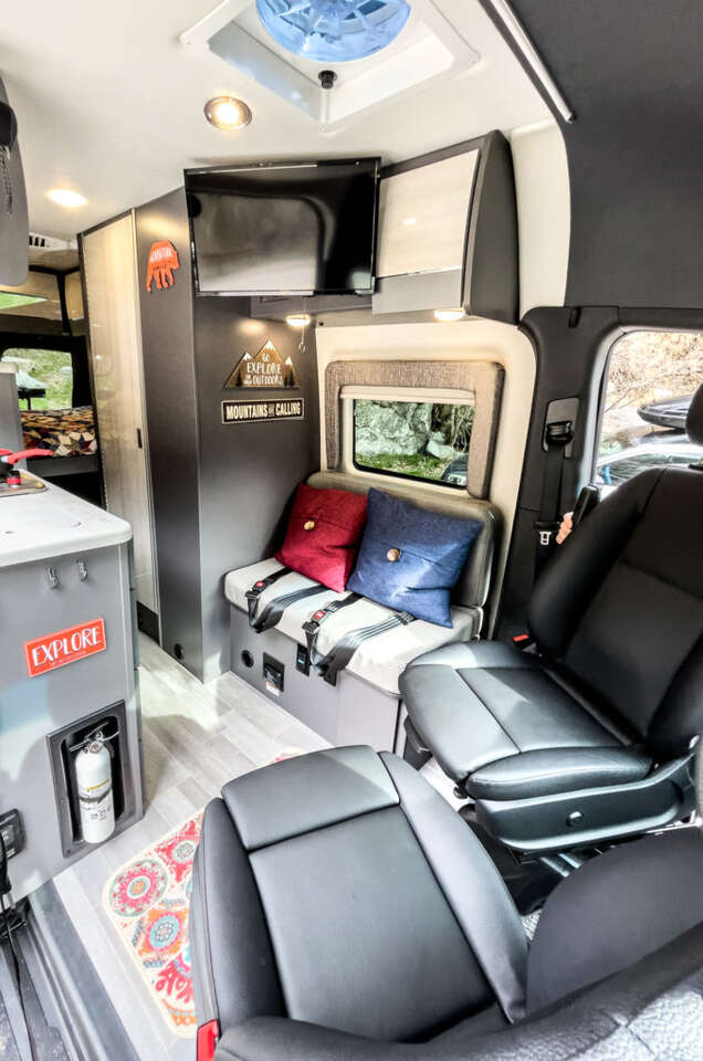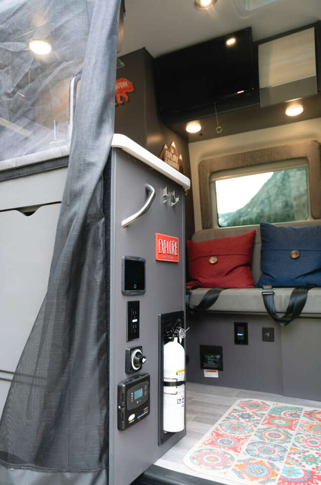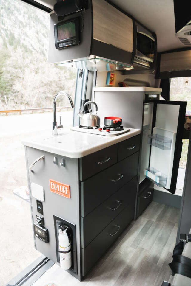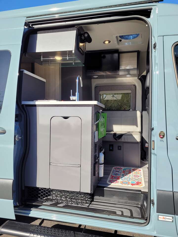 HAVE YOU EVER SEEN A TYVANNOSAURUS REX? Now’s your chance! TyVANnosaurus Rex is a stunning 4×4 Thor Sanctuary camper van ready to spring into action for a road trip to remember! This van is anything but a fossil and has everything you’ll need for an awesome #vanlife experience whether it’s a quick weekend getaway or a more epic adventure. TyVANnosaurus Rex seats and sleeps up to four people and the kitchen is complete with a stove, a sink with running hot or cold water, a fridge, and even a microwave for convenient culinary creations while camping. With a hearty electrical system and solar, you’ll be nicely powered up during your trip. If you’re craving some luxury after a long day of adventuring you can take a hot shower inside or outside before snuggling into bed for a good night’s sleep. This van feels so much like home, you’ll forget you’re camping on wheels! If you totally dig a good time, this is the van for you. TyVANnosaurus Rex is ready to roar! LOCATION This van is located in Kaysville, Utah about 26 miles north of Salt Lake City International Airport (SLC). AT A GLANCE · Seats: 4 · Sleeps: 4 · Pet Friendly: Yes · LIMITED ONE-WAY OPTION - This van can accommodate a one-way rental if your trip ends on a Friday night or Saturday morning. 125 miles per day are included with your rental. This van charges 50 cents per mile beyond this limit. · Transmission: Automatic · Length: 20 feet · Drive: 4x4 · Fuel: Diesel · This van can travel throughout: United States and Canada KEY FEATURES · Air Conditioner · Audio Inputs · Awning · Backup Camera · Bike Rack · CD Player · Ceiling Fan · Dining Table · Extra Storage · Solar Panel 20 gallon Gray Water Tank · Heater · Inside Shower · Inverter · Kitchen Sink · Microwave · Outside Shower · AM/FM/Satellite Radio · Refrigerator · Solar · 2 Burner Stove · Toilet w/ 4 gallon tank · TV/DVD · 24 gallon Water Tank. Tow Hitch (3500 lbs).
