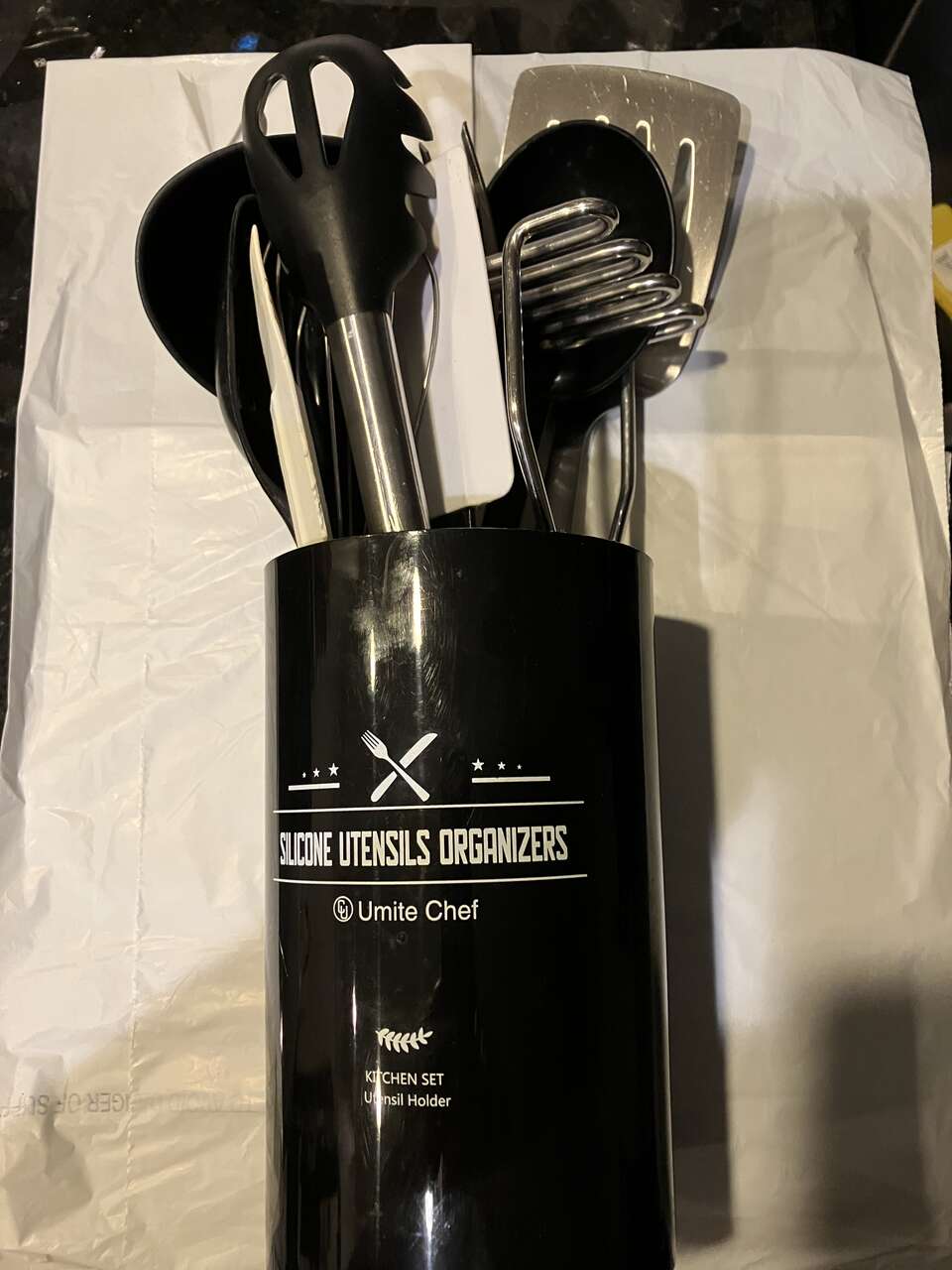 Venmo"UMITE CHEF" SILICONE UTENSILS ORGANIZERS BLACK CANISTER 7 INCHES TALL x 4.5 INCHES DIAMETER. Currently online for $8. In Like New Condition. Sanitized in dishwasher for your safety. See both photos. Only $4. Cash/Venmo. In Sandy. 801-201-5350.