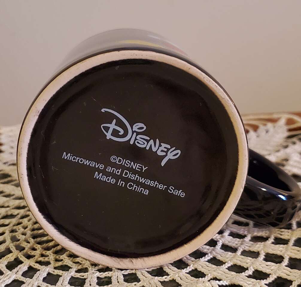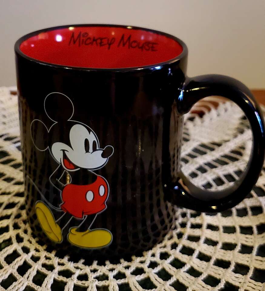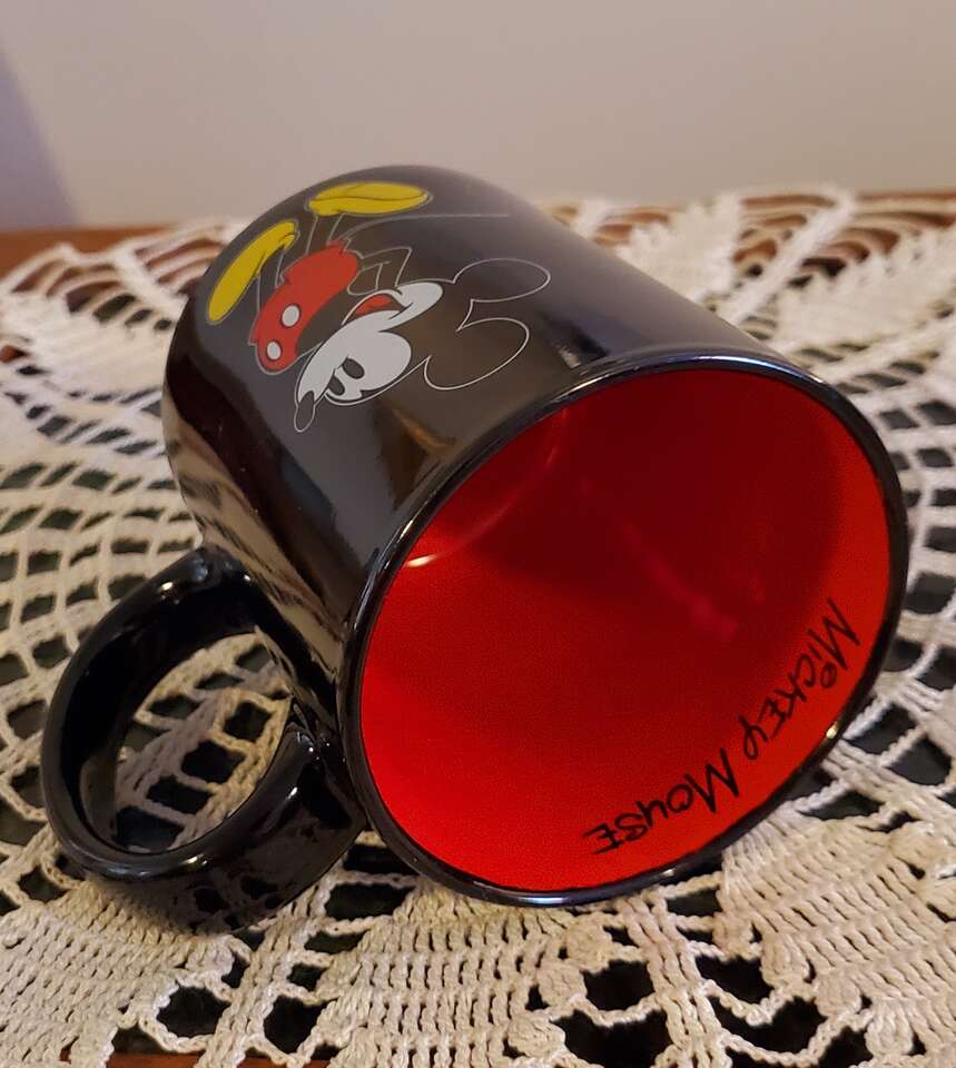 Disney Store Mickey Mouse 12oz Cup/Mug. Black outside, Red inside with Signature.