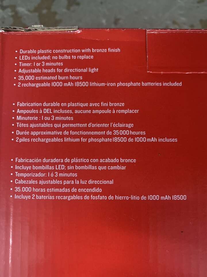 More info: https://www.lowes.com/pd/Utilitech-110-Degree-350-Lumen-Bronze-Integrated-LED-Motion-Activated-Flood-Light-with-Timer/1000110295