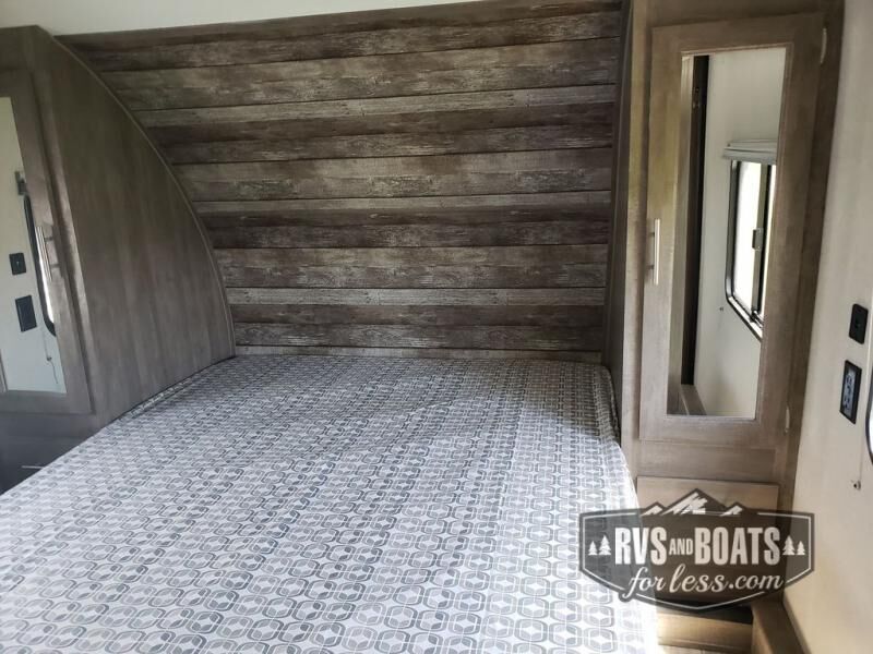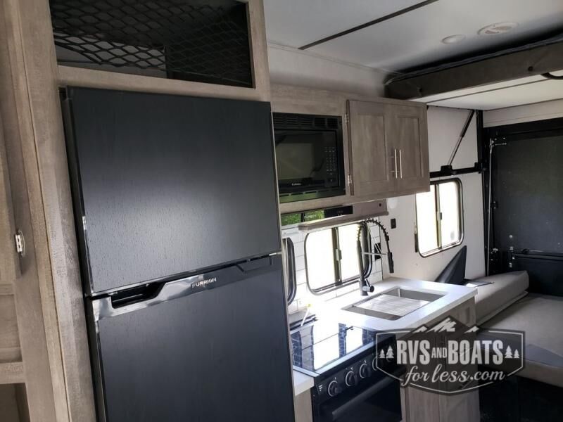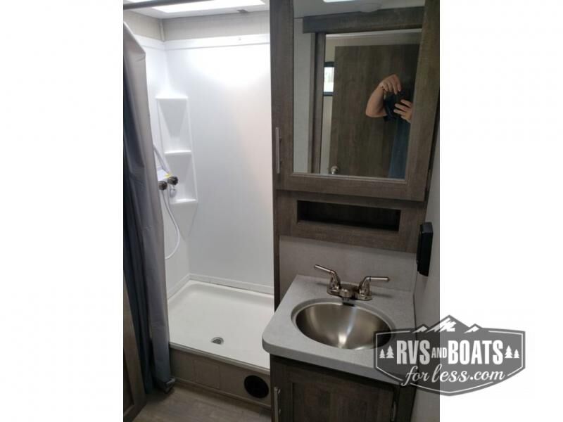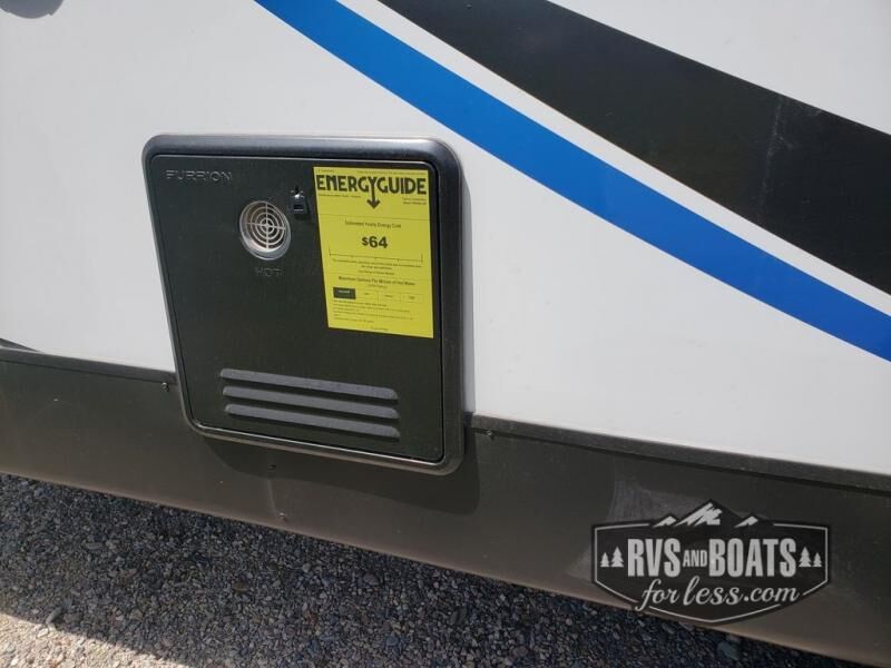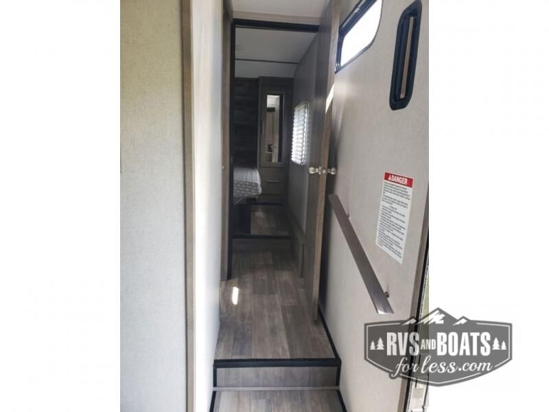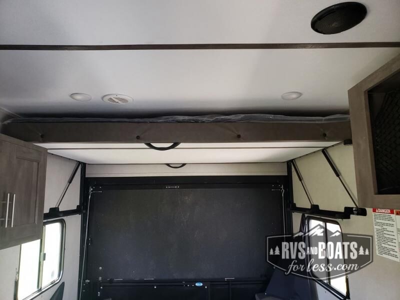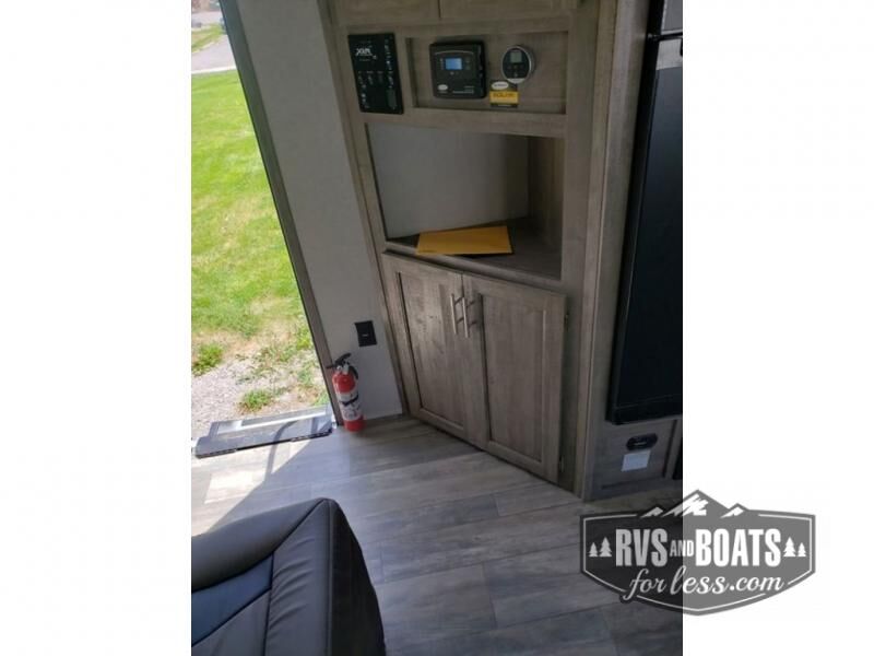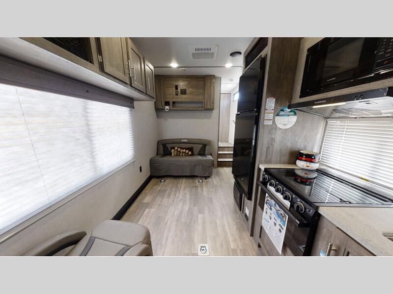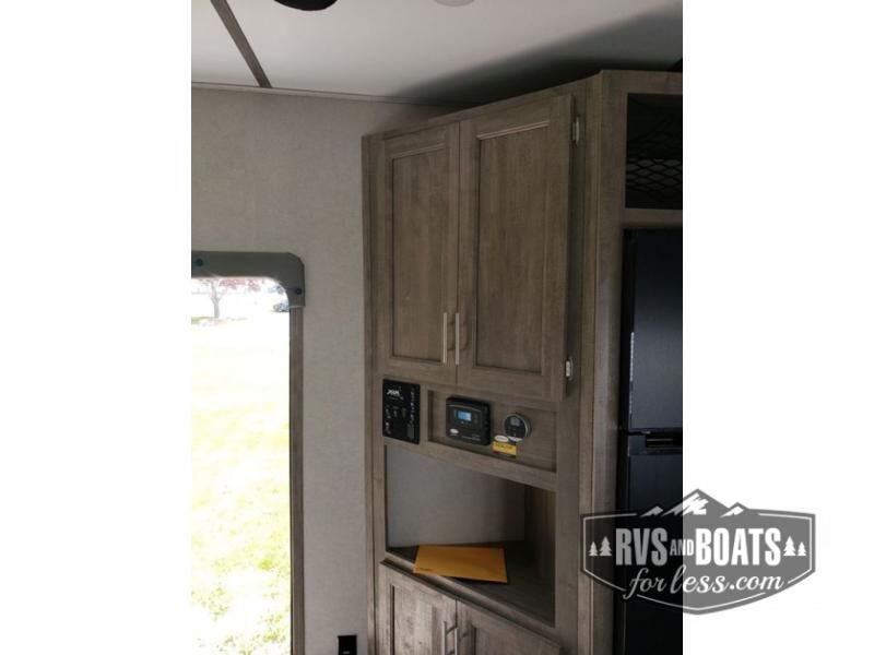 Pack your bags and head to your favorite camping spot in this fifth wheel for seven. The patio deck will be a big hit when entertaining guests, and if they decide to stay over, they can sleep on the Sleep N Store manual bed system. There are also Sit N Sleep sofas under the drop-down bed for even more sleeping space. While the chef of your group is preparing a meal on the three burner cooktop, everyone else can visit on the rollover sofa or the two barrel chairs. If you want a little more comfort, just choose the optional Euro recliners in place of the barrel chairs and you're good to go! The front private bedroom with an RV queen bed, night stands and beside shelves is sure to bring comfort, and you can clean up in the full bath before ending your day!