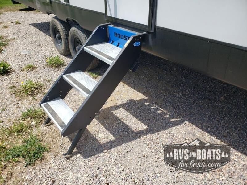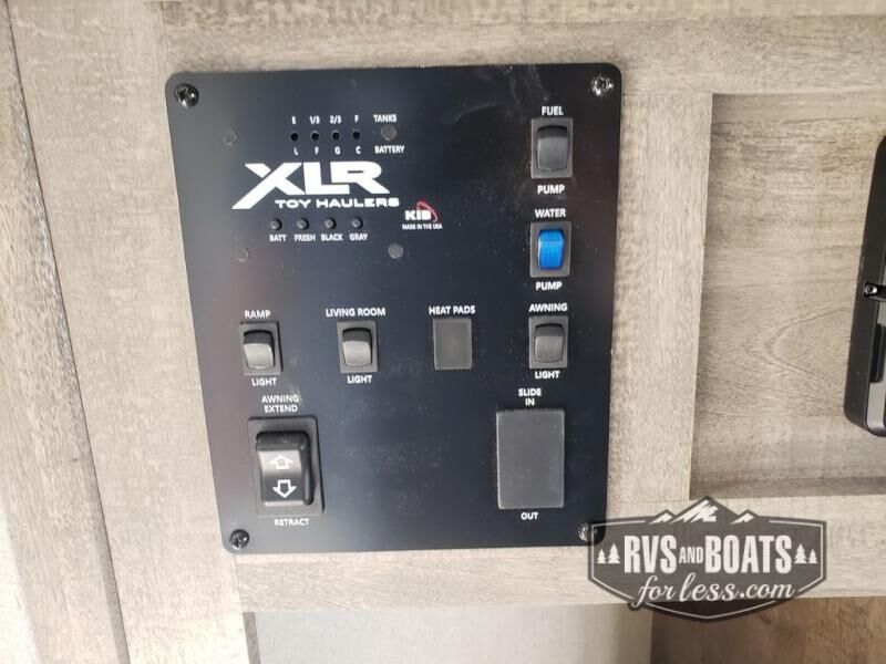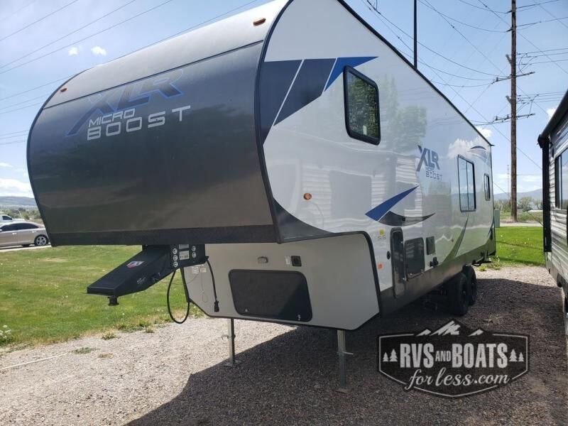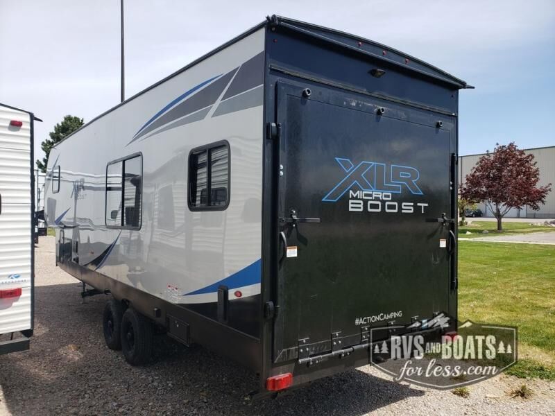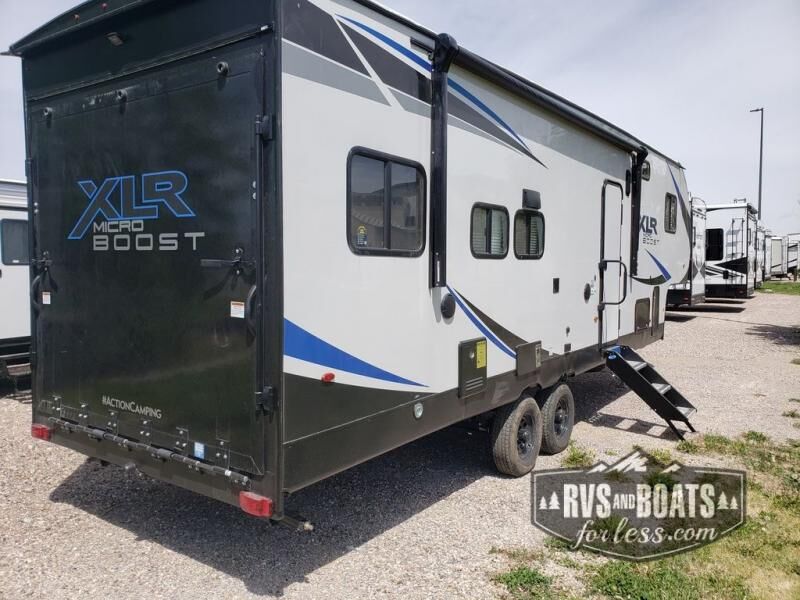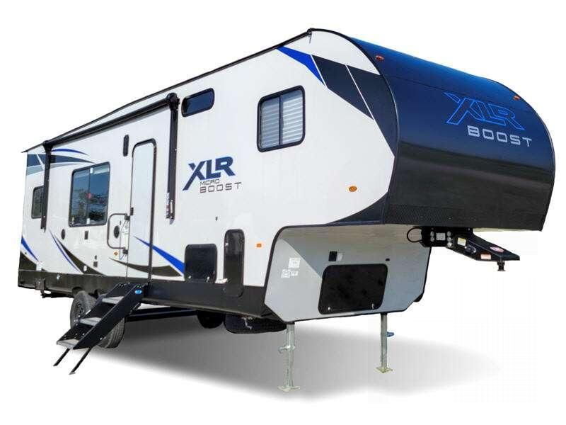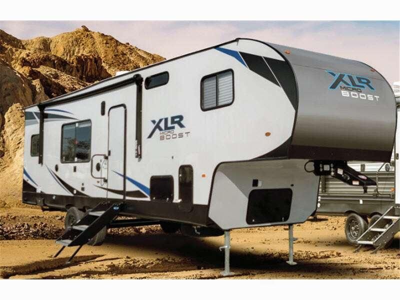 Each XLR Micro Boost toy hauler is made to last through years of use thanks to the seamless PVC roof system, the diamond plate front rock guard, and the Body Armor enclosed and insulated underbelly. You will appreciate the oil and gas resistant residential linoleum and the moisture barrier floor enclosure to keep your space clean, and the lightweight design will be perfect for smaller tow vehicles. Each model includes residential stainless steel sinks, decorative kitchen backsplash, solid core cabinet stiles, and large panoramic windows for breathtaking outdoor views. The exterior includes many convenient features to make camping easier than ever, including a pet leash for your furry friends, insulated storage doors, a hot and cold exterior shower, plus a friction hinge entry door. There is even a power awning with blue LED lights and two exterior speakers for the ultimate outdoor living space.