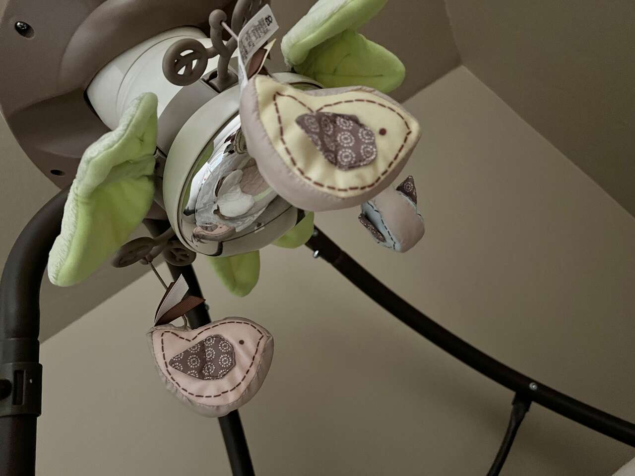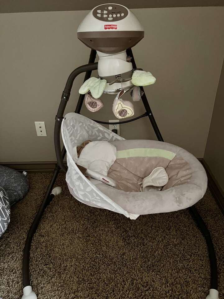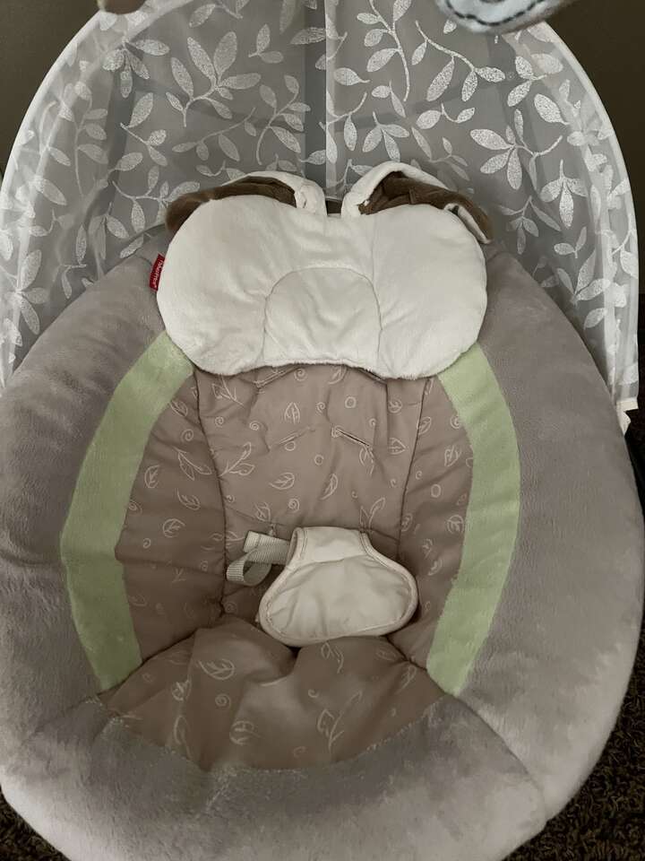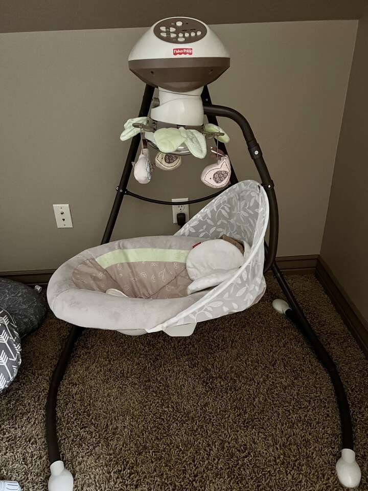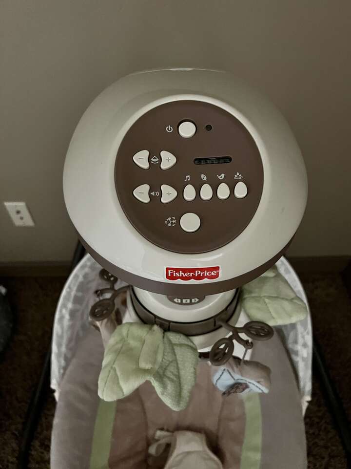 Excellent condition. This swing is great, it plugs into the wall so you never have to replace the batteries. Adjustable angle. The swing can turn, so they can swing forward and back or side to side. Plays music or nature sounds and has a mirr for baby. smoke free animal free home.