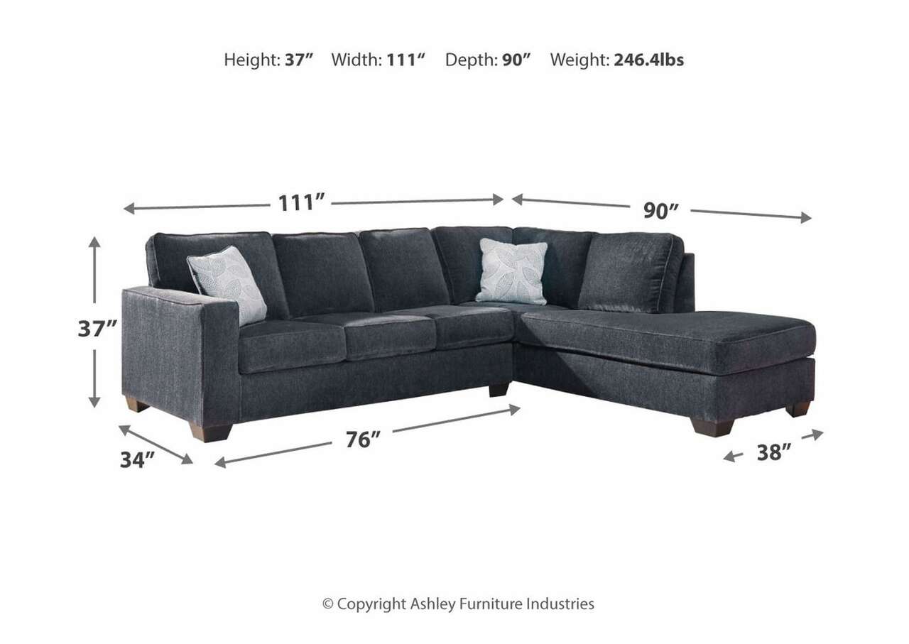 If style is the question, then this sectional is the answer. Sporting clean lines and sleek track arms, the decidedly contemporary profile is enhanced with plump cushioning and a chenille-feel upholstery, so pleasing to the touch. Sure to play well with so many color schemes, this sectional in slate gray includes a pair of understated floral pattern pillows for fashionably fresh appeal.Includes 2 pieces: right-arm facing corner chaise and left-arm facing sofa