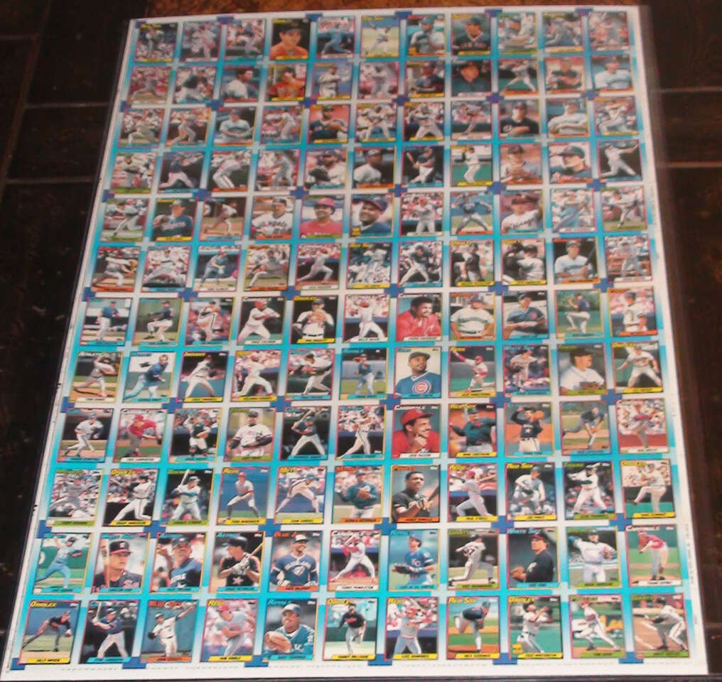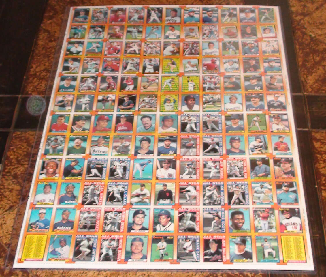 $175 or Best Offer! This is a rare complete set of all 6 1990 Topps Baseball Uncut Sheets that total the whole set of 792 cards. Each sheet has a total of 132 cards and measures 29 inches x 43 inches. The sheets come in 6 colors-Red, Orange, Green, Light Blue, Purple, and Dark Blue. You get every card in the set which as you will see from the checklist below includes many rookie cards, superstars, and hall of famers. This is not only a rare item but makes for great decoration on a wall as well as being a great conversation piece. You will notice that each sheet is framed in an acrylic holder. However this item is only the sheets. Set will come in a heavy duty corrugated tube.