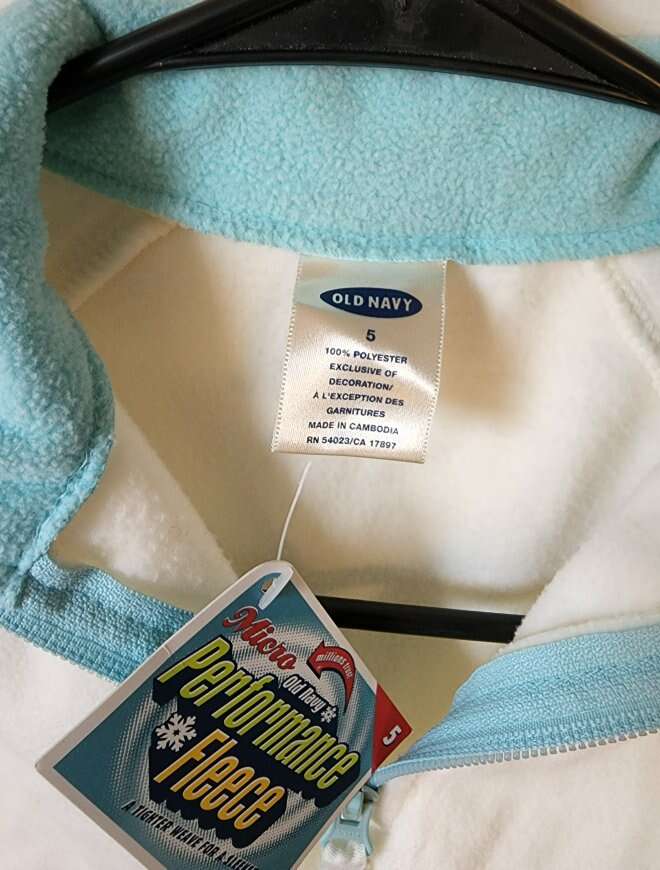Old Navy Performance Fleece, girls size 5. Cute off white and light blue color. New with tags. No smoking/no pets. No holds or deliveries. May be on other sites. Check out my other listings. Happy shopping!