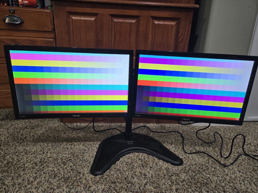 $80 - 2x Asus VS228H-P with Stand The ASUS VS228H-P is a 21.5-inch Full HD LED-backlit monitor known for its clear picture quality, multiple connectivity options (HDMI, DVI-D, VGA), and energy efficiency. It is often praised as a good value or budget-friendly option. Resolution: Full HD (1920 x 1080) Response Time: 5 ms (GTG) Refresh Rate: 60 Hz (max 75 Hz vertical sync) Brightness: 250 cd/m² Contrast Ratio: 1,000:1 (Native), 50,000,000:1 (Dynamic - ASCR) Viewing Angles: 170° (Horizontal) / 160° (Vertical) Connectivity: 1x HDMI, 1x DVI-D, 1x VGA (D-Sub) Color on one of the monitors has changed with age, so the same image on both monitors appears different in the standard configuration. The color palette is adjustable so you can get a better match, if desired.