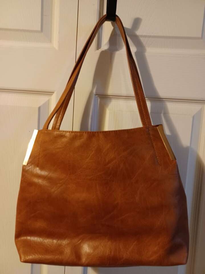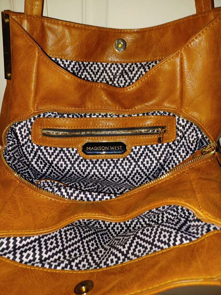 Like New condition Faux leather Brown with gold trim 3 compartments/ middle has zipper. Middle compartment has zippered side pocket and 2 other pockets.
