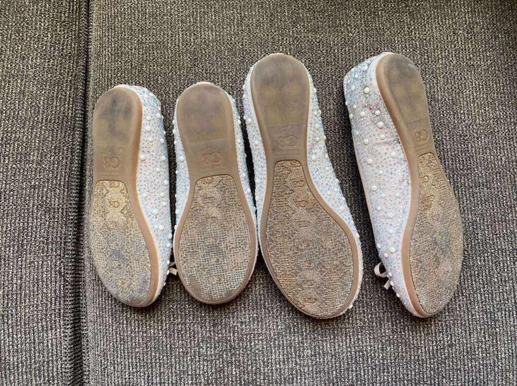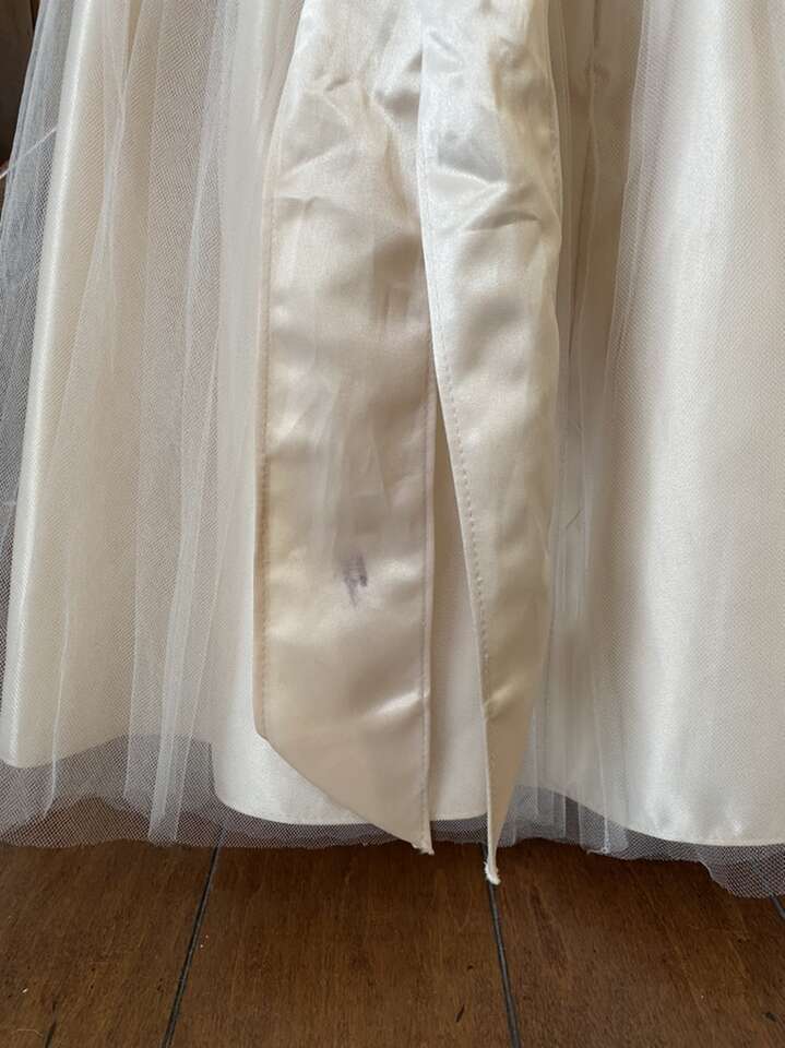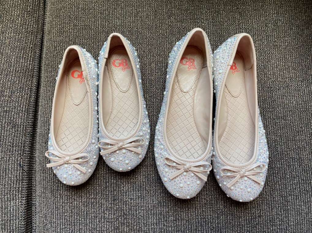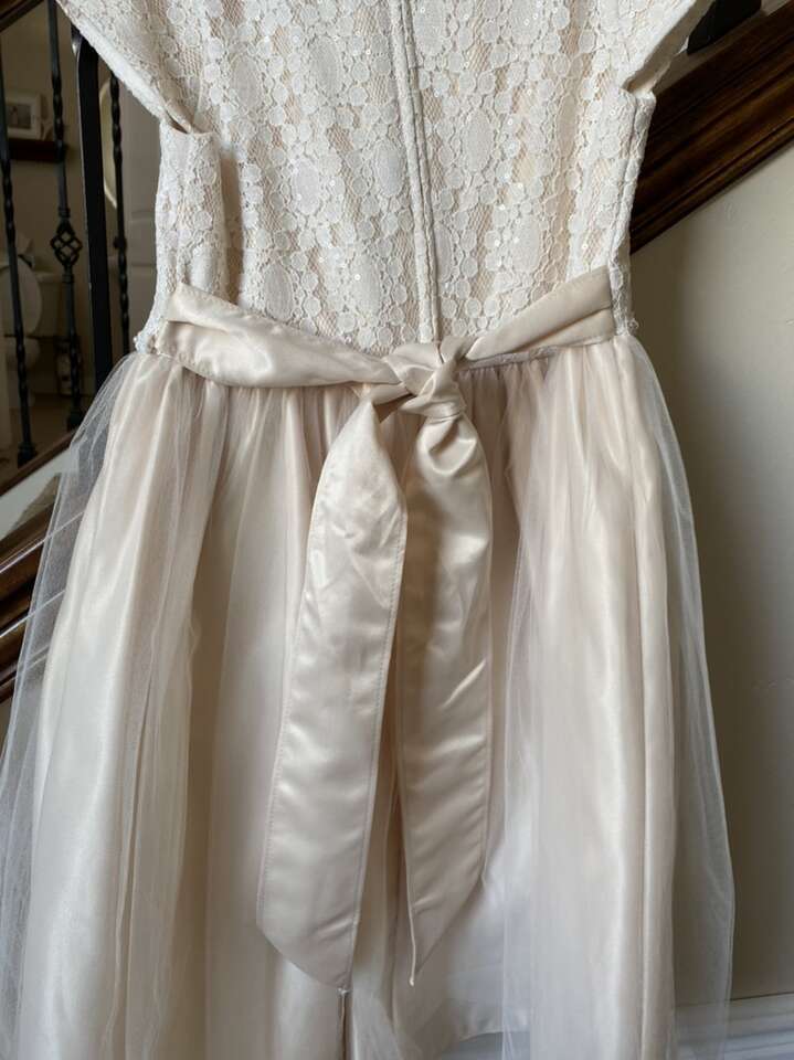 Semi formal dresses used when my daughters were flower girls in a wedding. Light beige/cream color. Very good condition but the smaller dress has a small spot on one of the ties in the back (see picture) Dresses are girls size 6 and 10 Shoes are in very good shape and are sparkly which doesn’t show up very well in the pictures. Sizes are 12 and 4. Hoping to sell shoes and dress as sets but not a must. Asking $50/set (dress and shoes) but open to offers.