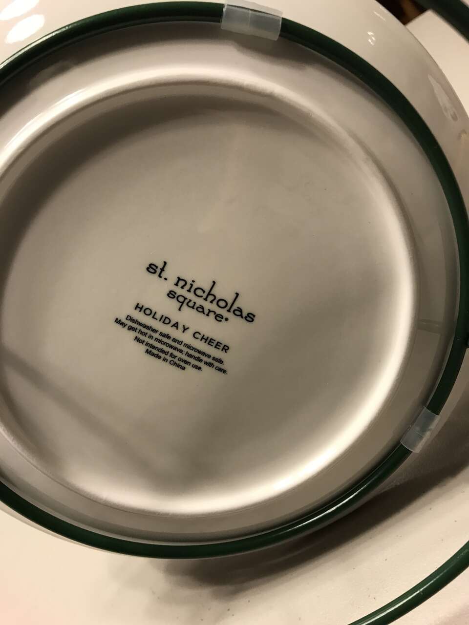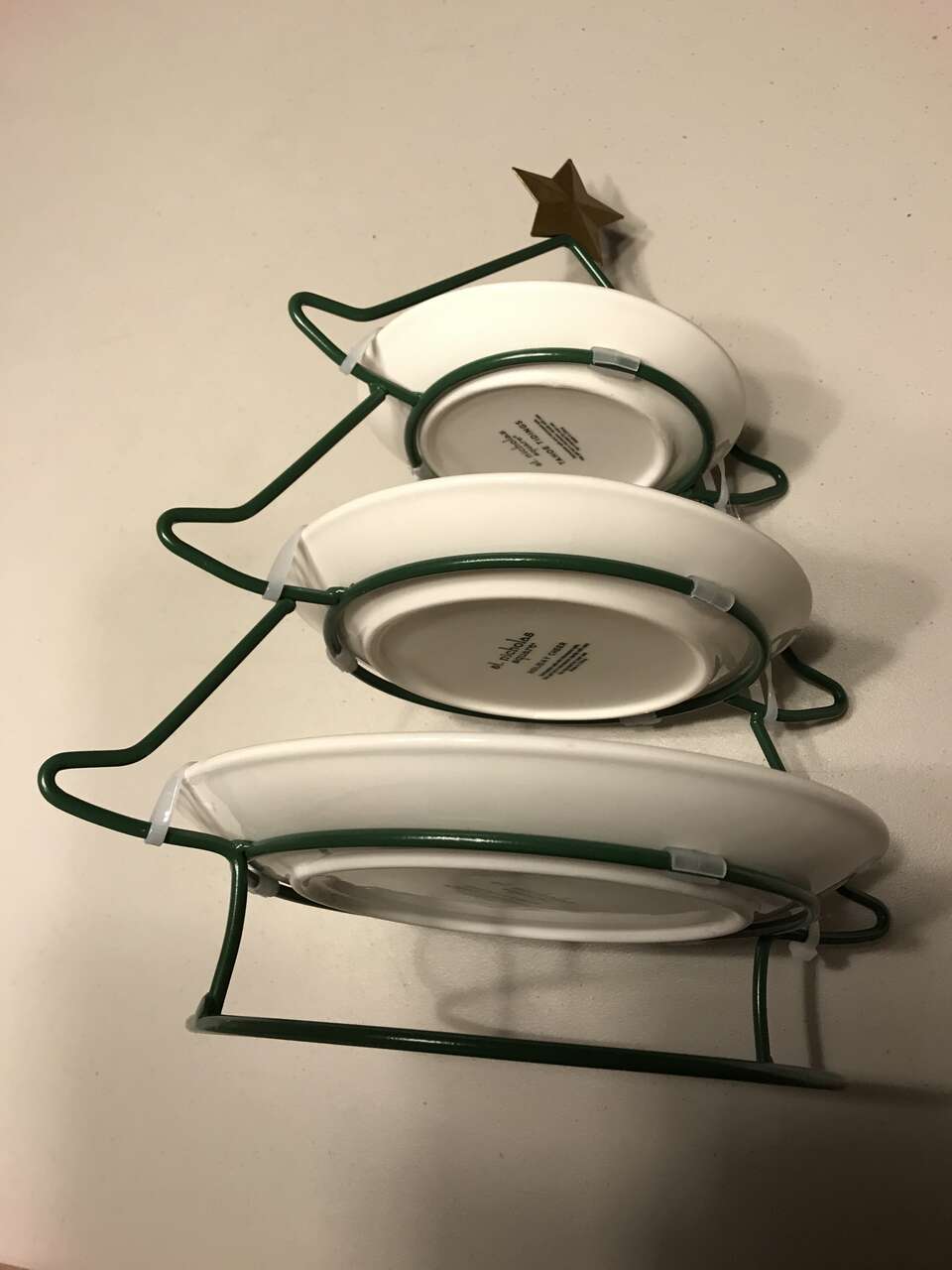 Very Rare St. Nicholas Square Holiday Cheer 3-Tier Tree Christmas Server, New with tie wraps still in place. The green metal tree the plates rest upon is about 14" high x 12 1/2" wide. The plates are hand painted. $50.00 Cash only. Original price was $64.99 at Kohl's. 5th picture is a price on eBay of a similar item.
