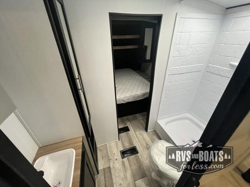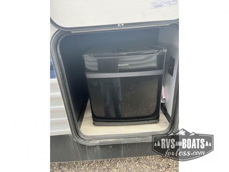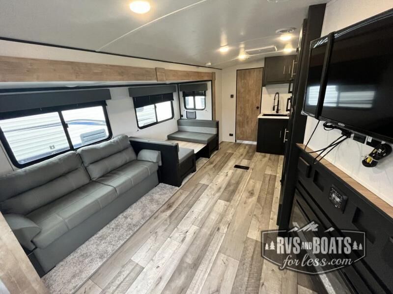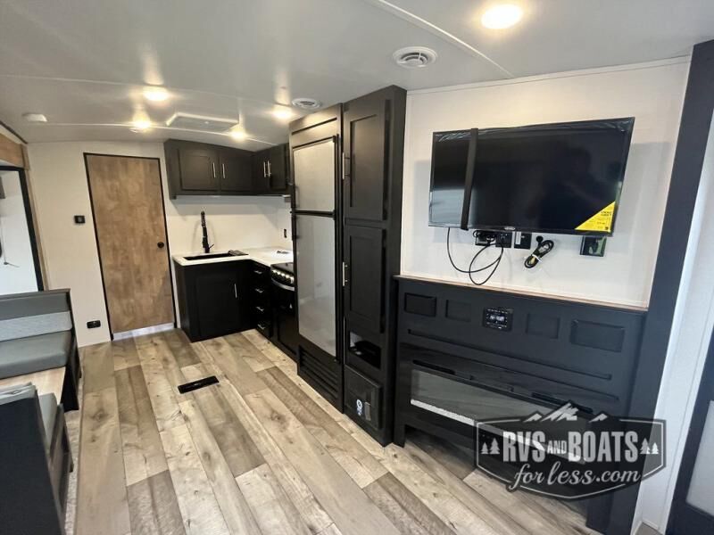If you want a quick weekend trip or a longer week in the woods, this travel trailer is going to be your best choice because it has everything needed to enjoy your time away! There is a large slide in the main living area to provide you with some extra floor space to relax on the sofa, and the booth dinette will be a cozy spot to sit down with a hot meal. You can use the three-burner range to prepare that meal, the L-shaped counter to serve your meals from, and you can store some canned goods and snacks in the pantry. The fireplace makes this combined space cozy especially during those chilly camping evenings. And the 21' power awning is available for use whenever you want to relax outdoors, just grab your camping chairs from the front pass-through compartment.