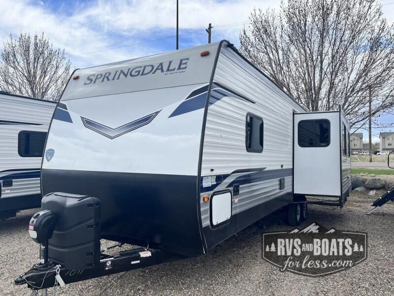 With any Keystone Springdale travel trailer, you will have a friction hinge entry door with sturdy LCI SolidStep steps, a pass-through storage compartment for your outdoor gear, and reliable Dexter E-Z Lube axles to maneuver your Springdale down the road and into the campsites. Some of the Keystone Exclusives provide 12V color-coded wiring with easy-to-trace circuits which is better than conventional RV wiring allowing a faster diagnosis for quicker repairs, and the streamlined heat distribution that uses in-floor heat vents for more efficiency for uninterrupted air flow. Also included, the Blade high performance air flow system that delivers 30% more air flow. The interior gives you pressed kitchen countertops, pleated night shades, and designer upholstered window valances for easy care and style, and more depending on the Springdale you choose!