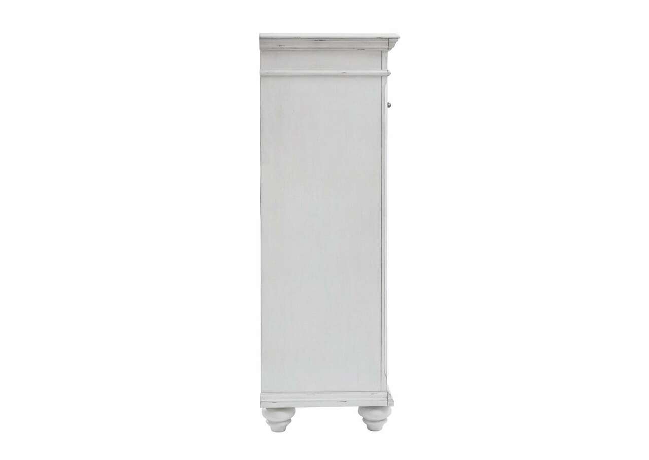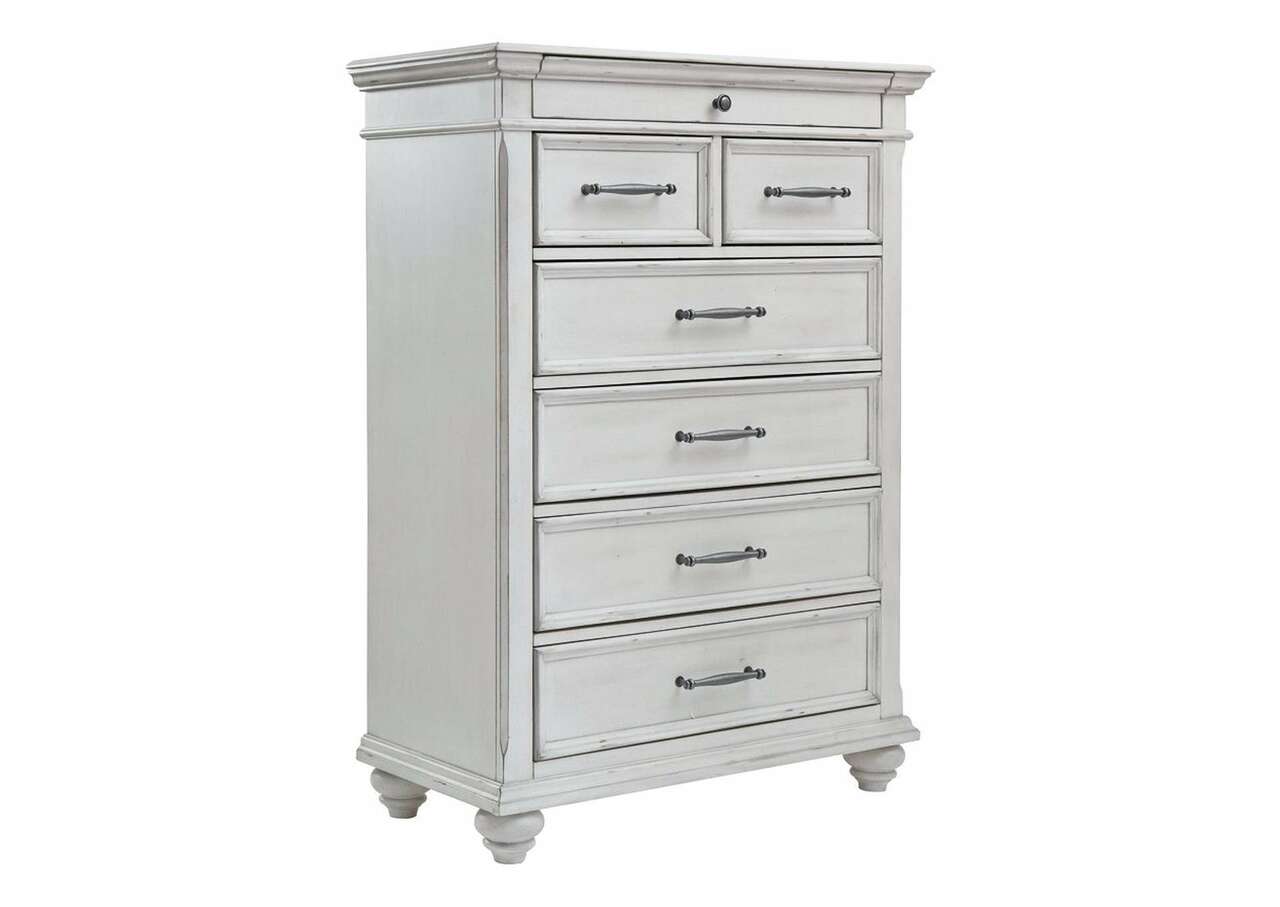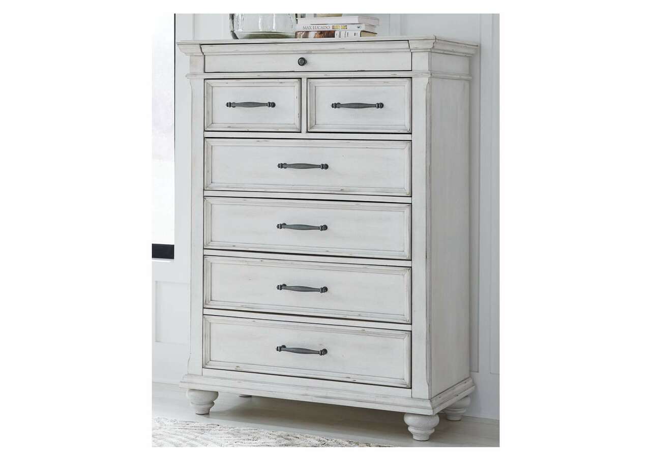 Give your retreat vintage charm and valuable drawer storage with the Kanwyn chest. In a beautifully distressed whitewash finish, you'll love putting it all away in casual style. Seven drawers will help you keep organized. Generously scaled moulding from top to bottom, along with bun feet and drawer handles with a transitional aesthetic, give this chest character—evoking the feel of a quaint cottage escape.Made with solid wood, veneers and engineered wood