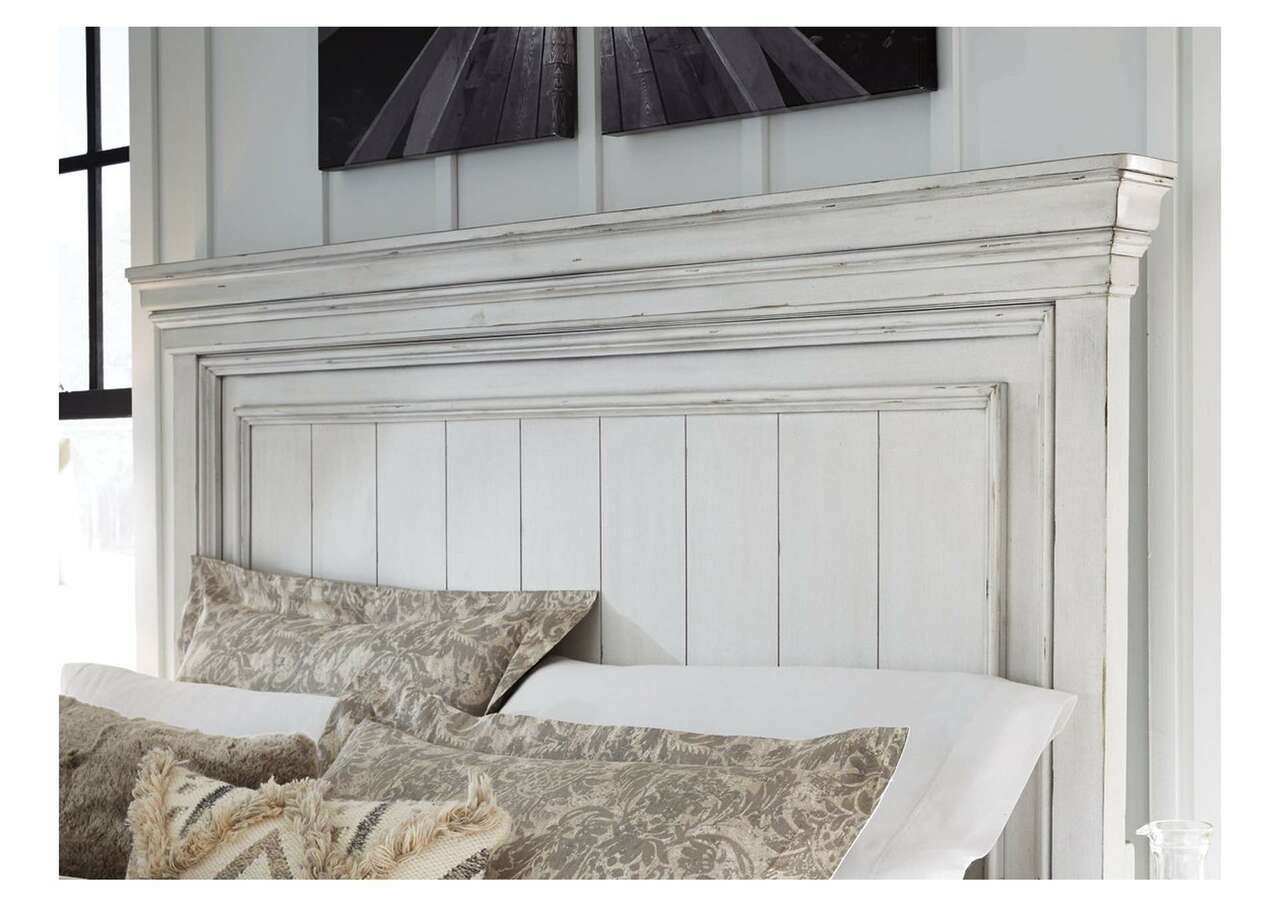 Give your retreat vintage charm with the Kanwyn king panel bed. In a beautifully distressed whitewash finish, you'll love the headboard's grand style featuring a picture framed panel. Generously scaled moulding from top to bottom, along with bun feet give this bed character—evoking the feel of a quaint cottage escape.Includes king panel headboard and footboard with king panel rails