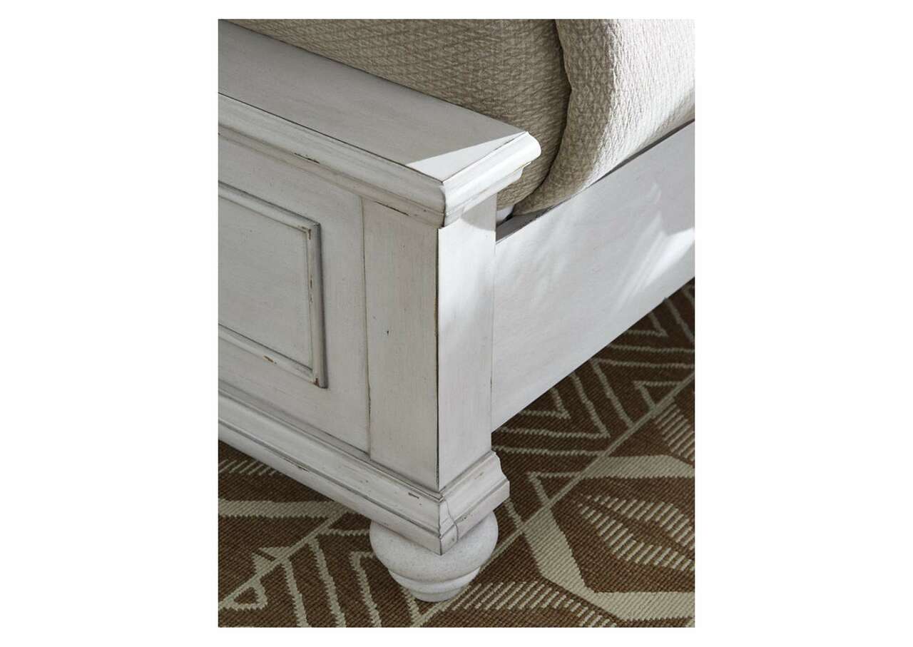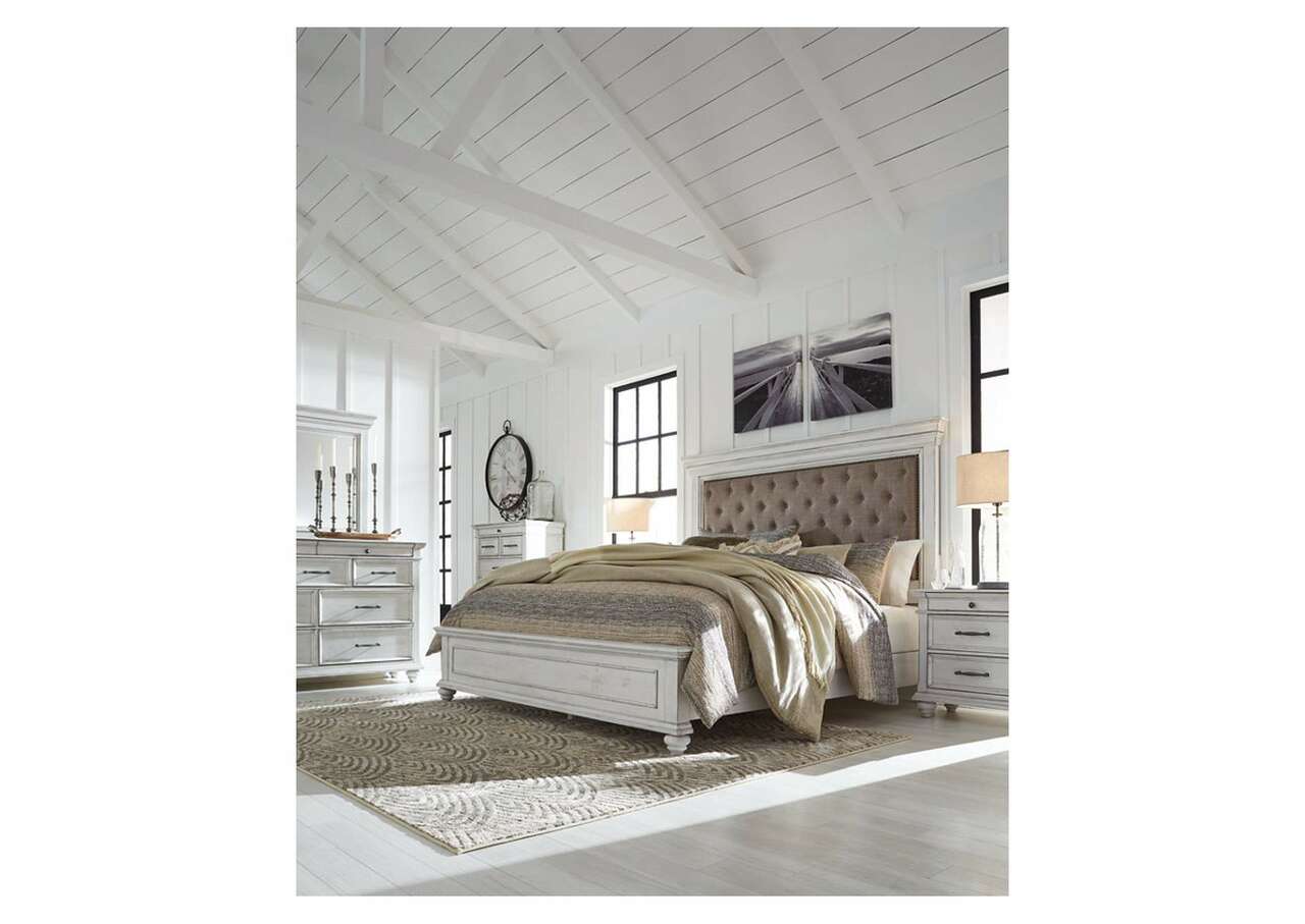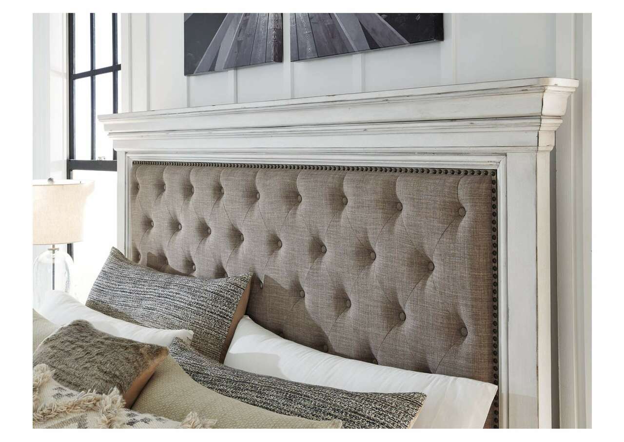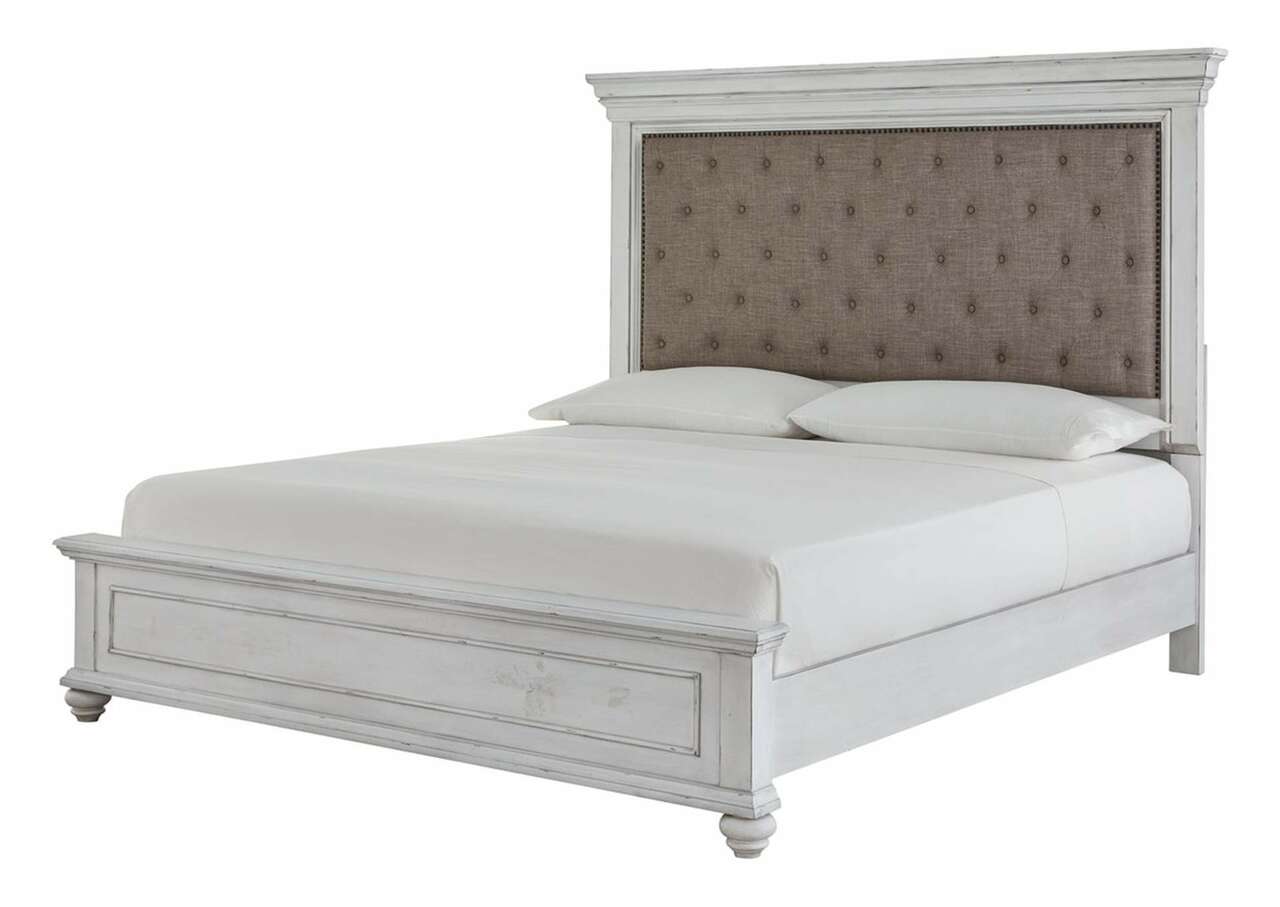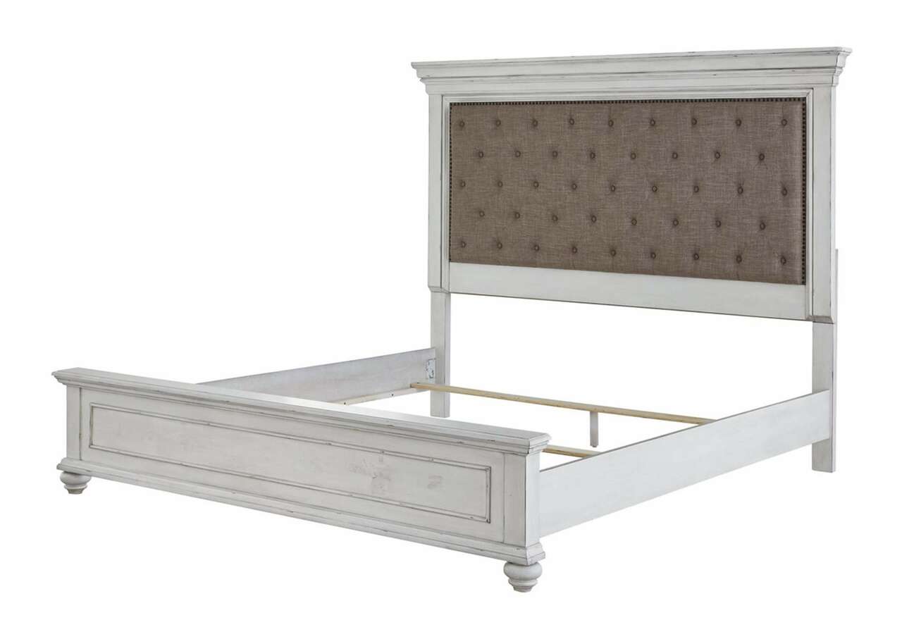 Give your retreat vintage charm with this queen upholstered panel bed. In a beautifully distressed whitewash finish, you'll love the headboard's grand style featuring an inset button tufted upholstery cushion. Generously scaled moulding from top to bottom, along with bun feet and nailhead trim give this bed character—evoking the feel of a quaint cottage escape.Includes queen upholstered headboard, panel footboard and rails