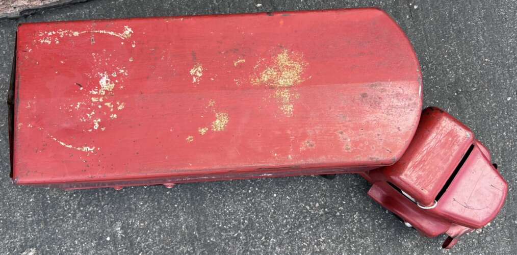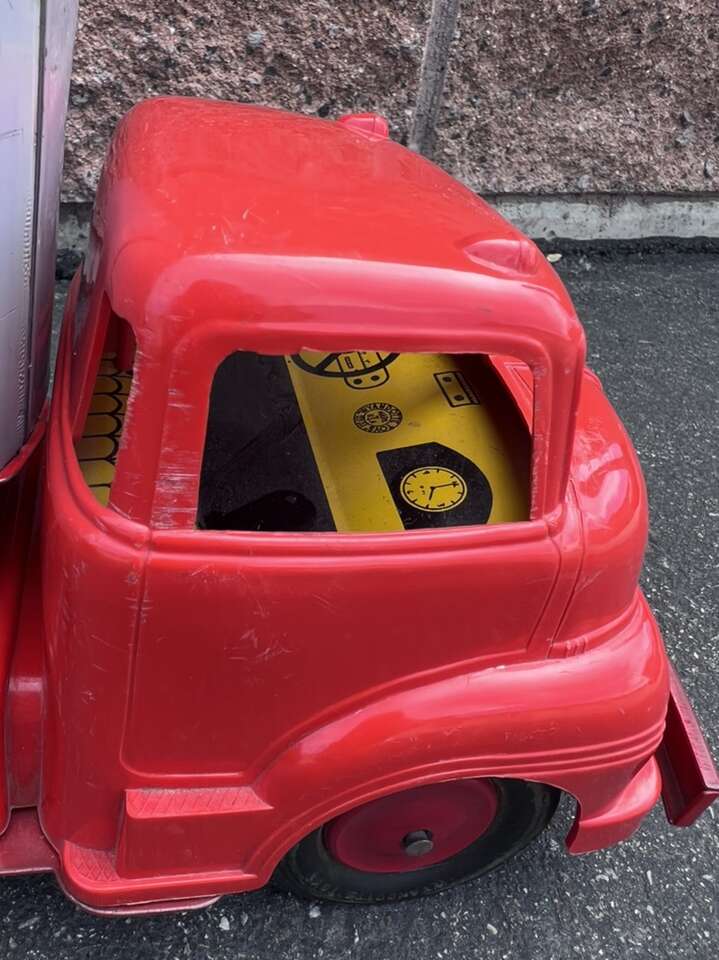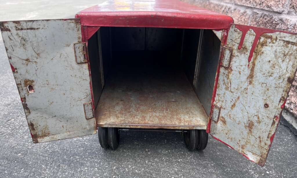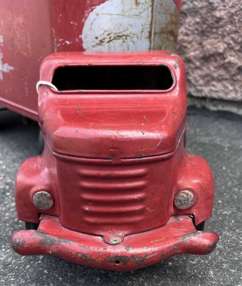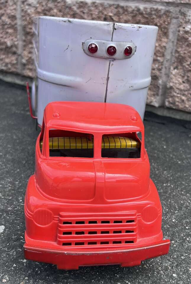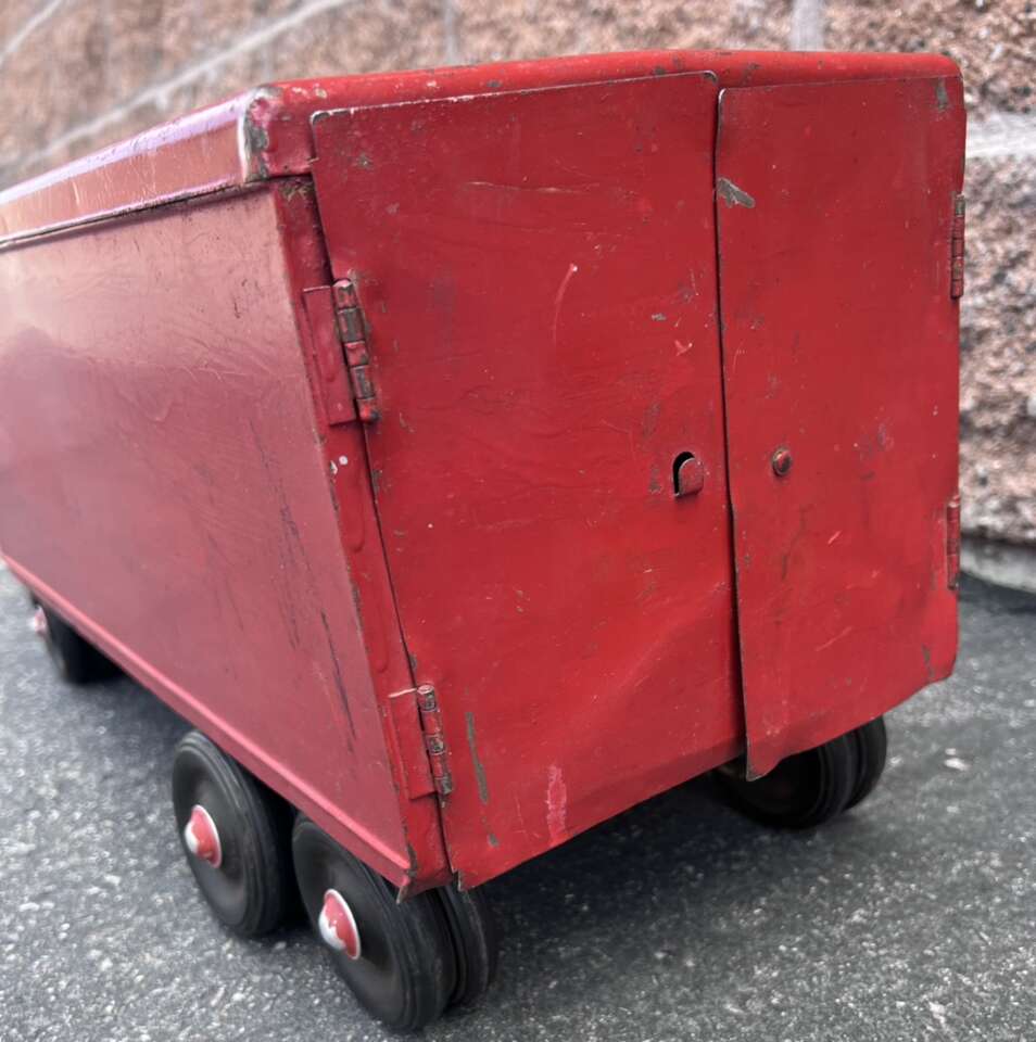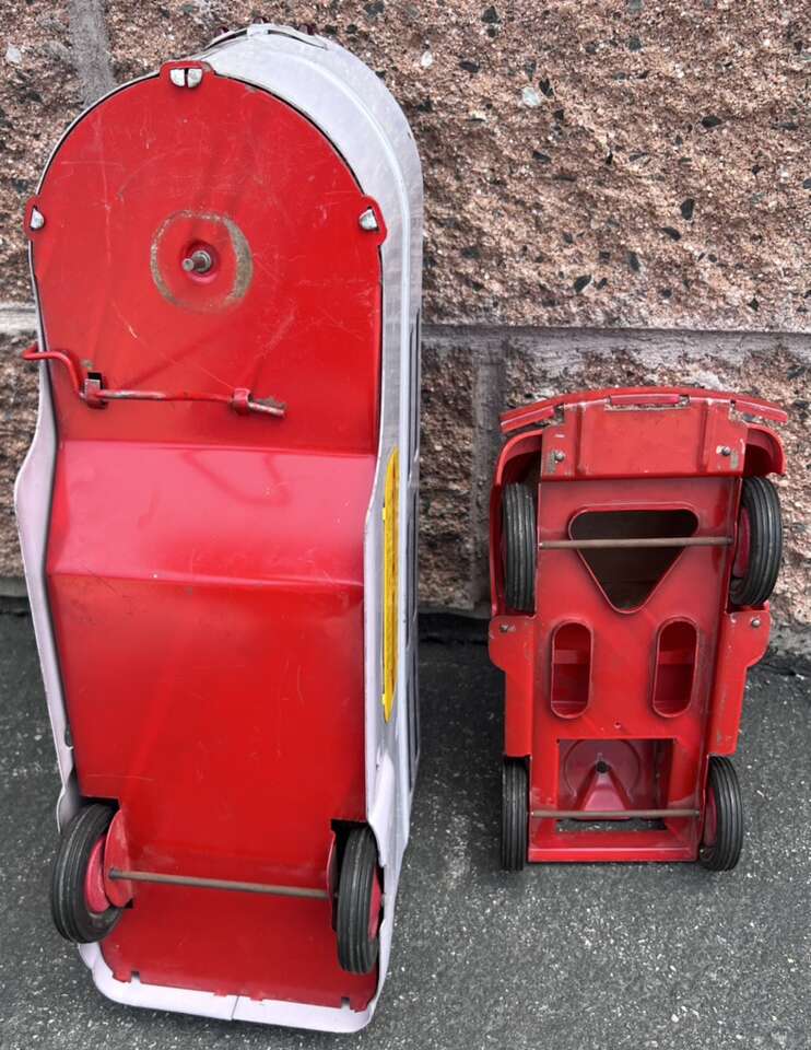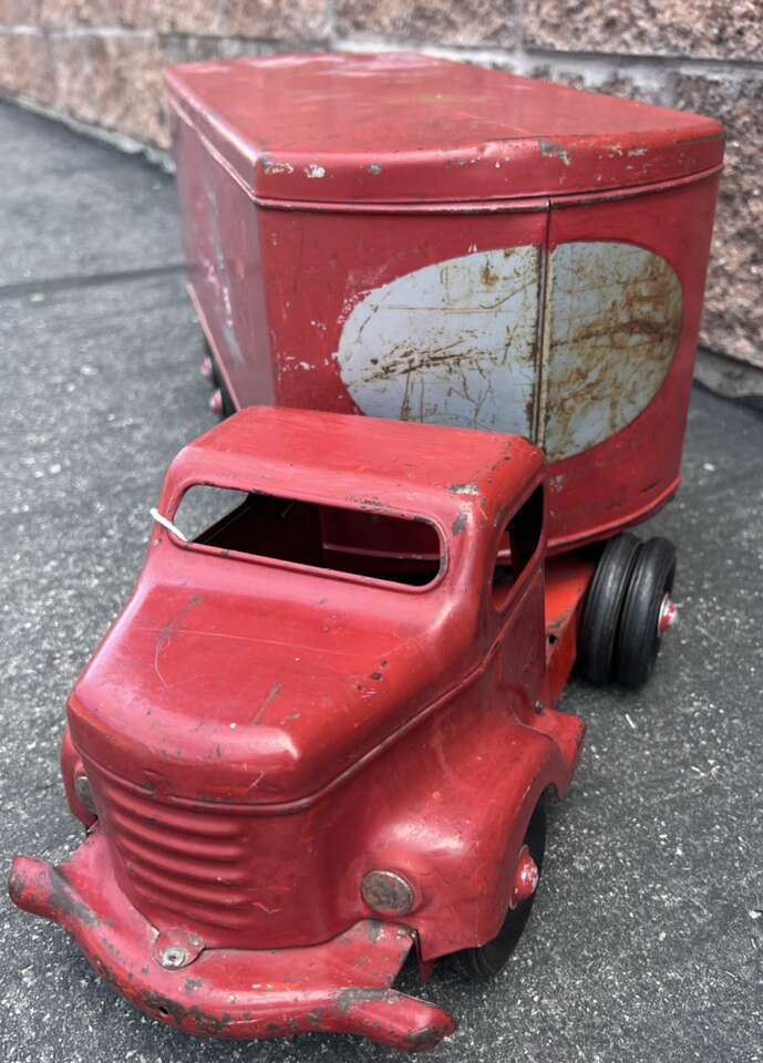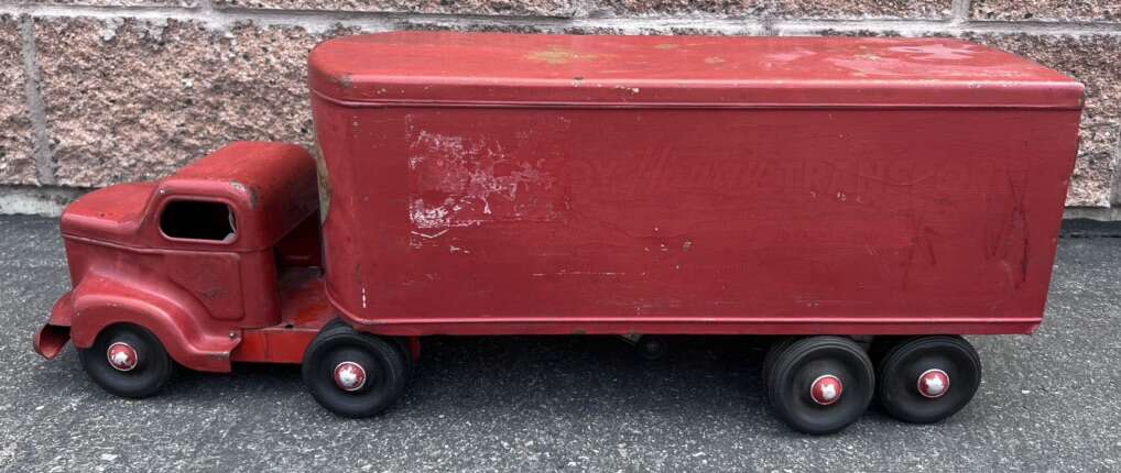 Left- $100 - 1950s 29” Minnitoy Hi-Way Transport Coast to Coast Service Metal Truck & Trailer. Graphics are faintly there.