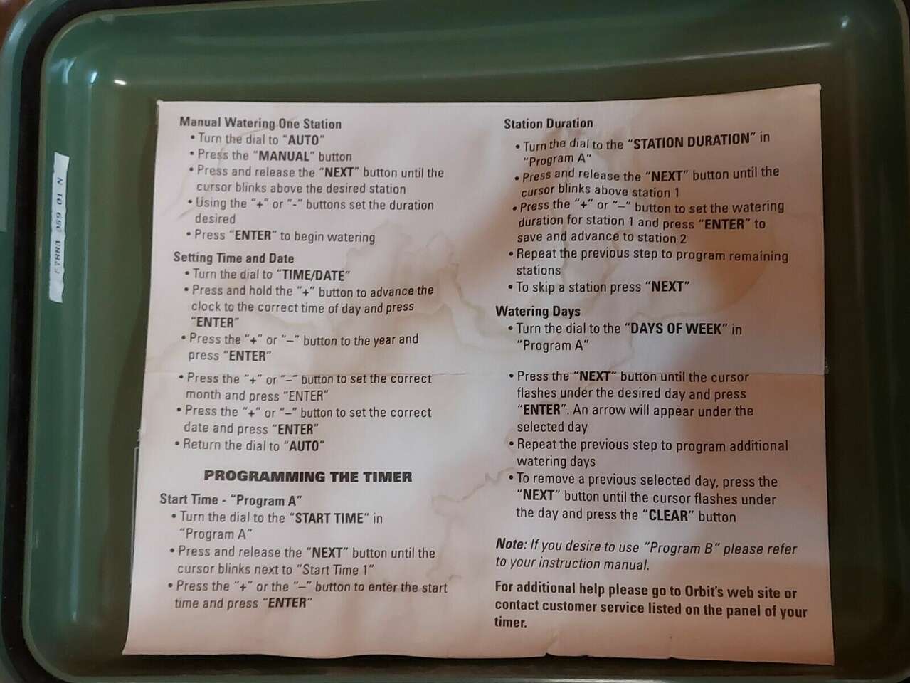 Programming Features Dual Programs This Timer has two programs (“Program A” and “Program B”) that allow you to set up separate watering schedules for your Lawn, Gardens or Shrubs. Fail-Safe Program If the timer loses AC power, the existing program, date and time will not be lost. After the AC power returns, the timer will recall the last program into memory. If both the AC power is lost and the battery is dead or missing, the user will have to reprogram the timer.